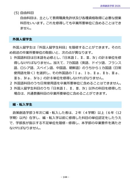 (5)自由科目政策創造学部2026自由科目は、主として教育職員免許状及び各種資格取得に必要な授業科目をいいます。これを修得しても卒業所要単位に含めることはできません。国人留学生外外国人留学生は「外国人留学生科目」を履修することができます。そのため前述の卒業所要単位の取扱いと、次の点が異なります。1外国語科目は日本語を必修とし、「日本語Ⅰ、Ⅱ、Ⅲ、Ⅳ」の計8単位を修得しなければなりません。加えて、7カ国語(英語、ドイツ語、フランス語、ロシア語、スペイン語、中国語、朝鮮語)のうちから1カ国語(日常使用語を除く)を選択し、その外国語の「Ⅰa、Ⅰb、Ⅱa、Ⅱb、Ⅲa、Ⅲb、Ⅳa、Ⅳb」の計8単位を修得しなければなりません。2外国語科目のうち日常使用語を卒業所要単位に含めることはできません。3外国人留学生科目のうち「日本語Ⅰ、Ⅱ、Ⅲ、Ⅳ」以外の科目を修得した場合は、共通教養科目の卒業所要単位に含めることができます。・転入学生編政策創造学部3年次に編・転入した者は、2年〈4学期〉以上(6年〈12学期〉以内)在学し、編・転入学以前に修得した科目の単位認定をしたうえで、学部長が指示する不足単位を履修・修得し、本学部の卒業要件を満たさなければなりません。-144-