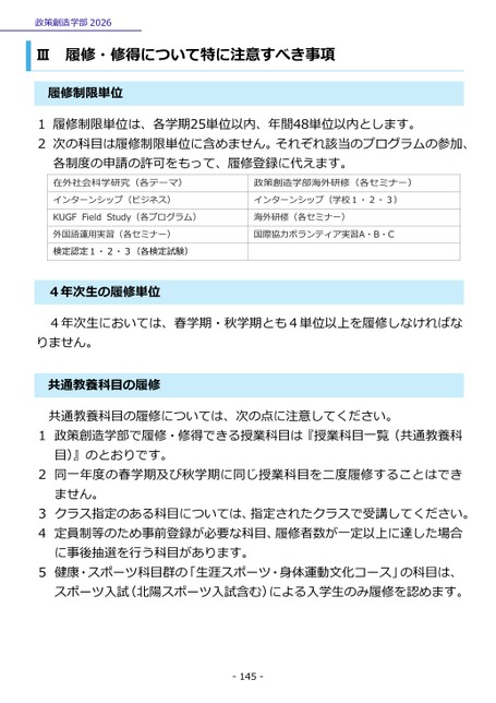 1履修制限単位は、各学期25単位以内、年間48単位以内とします。2次の科目は履修制限単位に含めません。それぞれ該当のプログラムの参加、各制度の申請の許可をもって、履修登録に代えます。在外社会科学研究(各テーマ)インターンシップ(ビジネス)政策創造学部海外研修(各セミナー)インターンシップ(学校1・2・3)海外研修(各セミナー)国際協力ボランティア実習A・B・CKUGFFieldStudy(各プログラム)外国語運用実習(各セミナー)検定認定1・2・3(各検定試験)年次生の履修単位44年次生においては、春学期・秋学期とも4単位以上を履修しなければな政策創造学部2026Ⅲ履修・修得について特に注意すべき事項履修制限単位通教養科目の履修共りません。共通教養科目の履修については、次の点に注意してください。1政策創造学部で履修・修得できる授業科目は『授業科目一覧(共通教養科目)』のとおりです。2同一年度の春学期及び秋学期に同じ授業科目を二度履修することはできません。3クラス指定のある科目については、指定されたクラスで受講してください。4定員制等のため事前登録が必要な科目、履修者数が一定以上に達した場合に事後抽選を行う科目があります。5健康・スポーツ科目群の「生涯スポーツ・身体運動文化コース」の科目は、スポーツ入試(北陽スポーツ入試含む)による入学生のみ履修を認めます。-145-