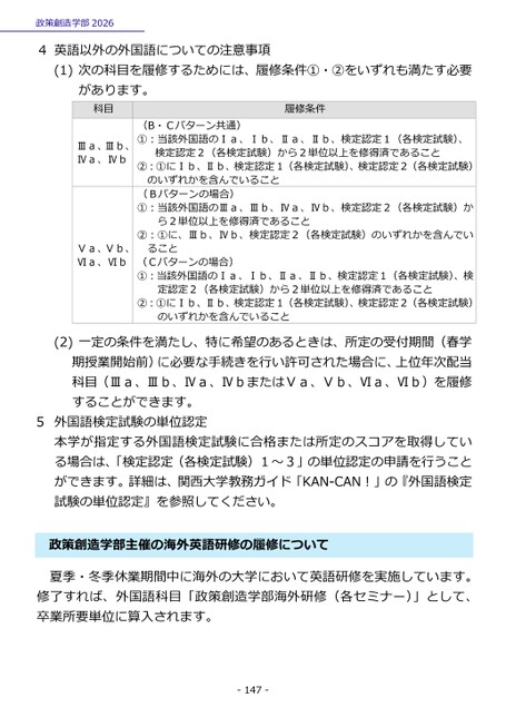 政策創造学部20264英語以外の外国語についての注意事項(1)次の科目を履修するためには、履修条件①・②をいずれも満たす必要があります。科目履修条件Ⅲa、Ⅲb、Ⅳa、ⅣbⅤa、Ⅴb、Ⅵa、Ⅵb(B・Cパターン共通)①:当該外国語のⅠa、Ⅰb、Ⅱa、Ⅱb、検定認定1(各検定試験)、検定認定2(各検定試験)から2単位以上を修得済であること②:①にⅠb、Ⅱb、検定認定1(各検定試験)、検定認定2(各検定試験)のいずれかを含んでいること(Bパターンの場合)①:当該外国語のⅢa、Ⅲb、Ⅳa、Ⅳb、検定認定2(各検定試験)から2単位以上を修得済であること②:①に、Ⅲb、Ⅳb、検定認定2(各検定試験)のいずれかを含んでいること(Cパターンの場合)①:当該外国語のⅠa、Ⅰb、Ⅱa、Ⅱb、検定認定1(各検定試験)、検定認定2(各検定試験)から2単位以上を修得済であること②:①にⅠb、Ⅱb、検定認定1(各検定試験)、検定認定2(各検定試験)のいずれかを含んでいること5(2)一定の条件を満たし、特に希望のあるときは、所定の受付期間(春学期授業開始前)に必要な手続きを行い許可された場合に、上位年次配当科目(Ⅲa、Ⅲb、Ⅳa、ⅣbまたはⅤa、Ⅴb、Ⅵa、Ⅵb)を履修することができます。外国語検定試験の単位認定本学が指定する外国語検定試験に合格または所定のスコアを取得している場合は、「検定認定(各検定試験)1~3」の単位認定の申請を行うことができます。詳細は、関西大学教務ガイド「KAN-CAN!」の『外国語検定試験の単位認定』を参照してください。策創造学部主催の海外英語研修の履修について政夏季・冬季休業期間中に海外の大学において英語研修を実施しています。修了すれば、外国語科目「政策創造学部海外研修(各セミナー)」として、卒業所要単位に算入されます。-147-