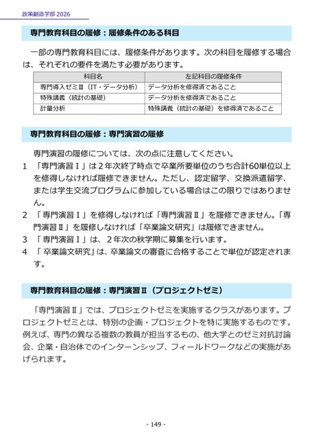一部の専門教育科目には、履修条件があります。次の科目を履修する場合は、それぞれの要件を満たす必要があります。科目名左記科目の履修条件専門導入ゼミⅢ(IT・データ分析)特殊講義(統計の基礎)計量分析データ分析を修得済であることデータ分析を修得済であること特殊講義(統計の基礎)を修得済であること専門教育科目の履修:専門演習の履修専門演習の履修については、次の点に注意してください。1「専門演習Ⅰ」は2年次終了時点で卒業所要単位のうち合計60単位以上を修得しなければ履修できません。ただし、認定留学、交換派遣留学、または学生交流プログラムに参加している場合はこの限りではありません。2「専門演習Ⅰ」を修得しなければ「専門演習Ⅱ」を履修できません。「専門演習Ⅱ」を履修しなければ「卒業論文研究」は履修できません。3「専門演習Ⅰ」は、2年次の秋学期に募集を行います。4「卒業論文研究」は、卒業論文の審査に合格することで単位が認定されま門教育科目の履修:専門演習Ⅱ(プロジェクトゼミ)専す。「専門演習Ⅱ」では、プロジェクトゼミを実施するクラスがあります。プロジェクトゼミとは、特別の企画・プロジェクトを特に実施するものです。例えば、専門の異なる複数の教員が担当するもの、他大学とのゼミ対抗討論会、企業・自治体でのインターンシップ、フィールドワークなどの実施があげられます。政策創造学部2026専門教育科目の履修:履修条件のある科目-149-
