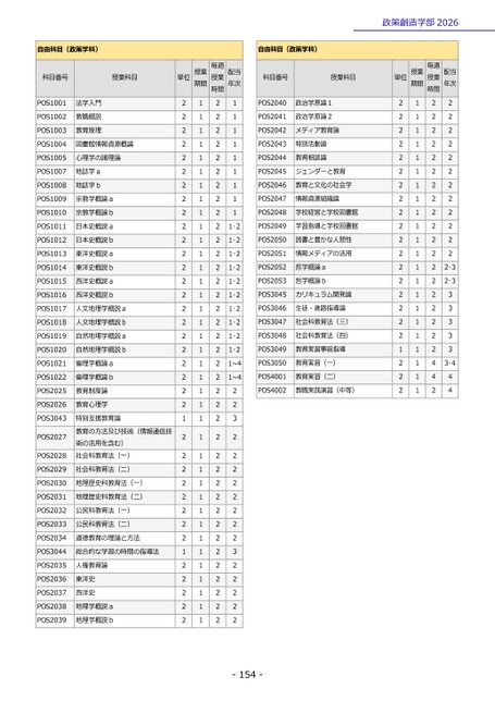-154-政策創造学部2026自由科目(政策学科)科目番号授業科目単位授業期間授業毎週時間配当年次POS1001法学入門2121POS1002教職概説2121POS1003教育原理2121POS1004図書館情報資源概論2121POS1005心理学の諸理論2121POS1007地誌学a2121POS1008地誌学b2121POS1009宗教学概論a2121POS1010宗教学概論b2121POS1011日本史概説a2121・2POS1012日本史概説b2121・2POS1013東洋史概説a2121・2POS1014東洋史概説b2121・2POS1015西洋史概説a2121・2POS1016西洋史概説b2121・2POS1017人文地理学概説a2121・2POS1018人文地理学概説b2121・2POS1019自然地理学概説a2121・2POS1020自然地理学概説b2121・2POS1021倫理学概論a2121~4POS1022倫理学概論b2121~4POS2025教育制度論2122POS2026教育心理学2122POS3043社会科教育法(一)教育の方法及び技術(情報通信技特別支援教育論術の活用を含む)1123POS20272122POS20282122POS2029社会科教育法(二)2122POS2030地理歴史科教育法(一)2122POS2031地理歴史科教育法(二)2122POS2032公民科教育法(一)2122POS2033公民科教育法(二)2122POS2034道徳教育の理論と方法2122POS3044総合的な学習の時間の指導法1123POS2035人権教育論2122POS2036東洋史2122POS2037西洋史2122POS2038地理学概説a2122POS2039地理学概説b2122自由科目(政策学科)科目番号授業科目単位授業期間授業毎週時間配当年次POS2040政治学原論12122POS2041政治学原論22122POS2042メディア教育論2122POS2043特別活動論2122POS2044教育相談論2122POS2045ジェンダーと教育2122POS2046教育と文化の社会学2122POS2047情報資源組織論2122POS2048学校経営と学校図書館2122POS2049学習指導と学校図書館2122POS2050読書と豊かな人間性2122POS2051情報メディアの活用2122POS2052哲学概論a2122・3POS2053哲学概論b2122・3POS3045カリキュラム開発論2123POS3046生徒・進路指導論2123POS3047社会科教育法(三)2123POS3048社会科教育法(四)2123POS3049教育実習事前指導1123POS3050教育実習(一)2143・4POS4001教育実習(二)2144POS4002教職実践演習(中等)2124