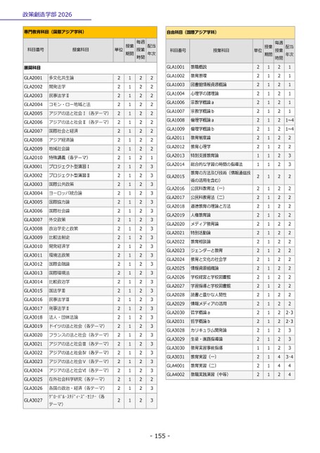 政策創造学部2026-155-専門教育科目(国際アジア学科)科目番号授業科目単位授業期間授業毎週時間配当年次展開科目GLA2001多文化共生論2122GLA2002開発法学2122GLA2003民事法学Ⅱ2122GLA2004コモン・ロー地域と法2122GLA2005アジアの法と社会Ⅰ(各テーマ)2122GLA2006アジアの法と社会Ⅱ(各テーマ)2122GLA2007国際社会と経済2122GLA2008アジア経済論2122GLA2009地域社会論2122GLA2010特殊講義(各テーマ)2121GLA3001プロジェクト型演習Ⅰ2123GLA3002プロジェクト型演習Ⅱ2123GLA3003国際公共政策2123GLA3004ヨーロッパ統合論2123GLA3005国際協力論2123GLA3006国際社会論2123GLA3007外交政策2123GLA3008政治学史と政策2123GLA3009比較法制史2123GLA3010開発経済学2123GLA3011環境法政策2123GLA3012国際金融論2123GLA3013国際環境法2123GLA3014比較政治学2123GLA3015国法学Ⅲ2123GLA3016民事法学Ⅲ2123GLA3017刑事法学Ⅱ2123GLA3018法人・団体法論2123GLA3019ドイツの法と社会(各テーマ)2123GLA3020フランスの法と社会(各テーマ)2123GLA3021アジアの法と社会Ⅲ(各テーマ)2123GLA3022アジアの法と社会Ⅳ(各テーマ)2123GLA3023アジアの法と社会Ⅴ(各テーマ)2123GLA3024アジアの法と社会Ⅵ(各テーマ)2123GLA3025在外社会科学研究(各テーマ)2122GLA3026グローバル・スタディーズ・セミナー(各各国の政治・経済(各テーマ)テーマ)2123GLA30272123自由科目(国際アジア学科)科目番号授業科目単位授業期間授業毎週時間配当年次GLA1001教職概説2121GLA1002教育原理2121GLA1003図書館情報資源概論2121GLA1004心理学の諸理論2121GLA1006宗教学概論a2121GLA1007宗教学概論b2121GLA1008倫理学概論a2121~4GLA1009倫理学概論b2121~4GLA2011教育制度論2122GLA2012教育心理学2122GLA2013特別支援教育論1123GLA2014術の活用を含む)総合的な学習の時間の指導法教育の方法及び技術(情報通信技公民科教育法(一)1123GLA20152122GLA20162122GLA2017公民科教育法(二)2122GLA2018道徳教育の理論と方法2122GLA2019人権教育論2122GLA2020メディア教育論2122GLA2021特別活動論2122GLA2022教育相談論2122GLA2023ジェンダーと教育2122GLA2024教育と文化の社会学2122GLA2025情報資源組織論2122GLA2026学校経営と学校図書館2122GLA2027学習指導と学校図書館2122GLA2028読書と豊かな人間性2122GLA2029情報メディアの活用2122GLA2030哲学概論a2122・3GLA2031哲学概論b2122・3GLA3028カリキュラム開発論2123GLA3029生徒・進路指導論2123GLA3030教育実習事前指導1123GLA3031教育実習(一)2143・4GLA4001教育実習(二)2144GLA4002教職実践演習(中等)2124