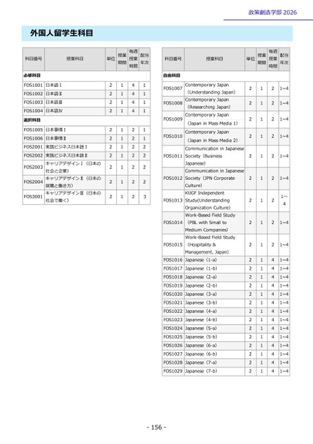 外国人留学生科目科目番号授業科目必修科目FOS1001日本語ⅠFOS1002日本語ⅡFOS1003日本語ⅢFOS1004日本語Ⅳ選択科目FOS1005日本事情ⅠFOS1006日本事情ⅡFOS2001実践ビジネス日本語ⅠFOS2002FOS2003FOS2004FOS3001実践ビジネス日本語ⅡキャリアデザインⅠ(日本の社会と企業)キャリアデザインⅡ(日本の就職と働き方)キャリアデザインⅢ(日本の社会で働く)単位授業期間毎週授業時間配当年次22222222222111111111114444222222211111122223政策創造学部2026科目番号授業科目単位授業期間毎週授業時間配当年次自由科目FOS1007FOS1008FOS1009FOS1010FOS1011FOS1012FOS1013FOS1014FOS1015FOS1016ContemporaryJapan(UnderstandingJapan)ContemporaryJapan(ResearchingJapan)ContemporaryJapan(JapaninMassMedia1)ContemporaryJapan(JapaninMassMedia2)CommunicationinJapaneseSociety(BusinessJapanese)CommunicationinJapaneseSociety(JPNCorporateCulture)KUGFIndependentStudy(UnderstandingOrganizationCulture)Work-BasedFieldStudy(PBLwithSmalltoMediumCompanies)Work-BasedFieldStudy(Hospitality&Management,Japan)Japanese(1-a)FOS1017Japanese(1-b)FOS1018Japanese(2-a)FOS1019Japanese(2-b)FOS1020Japanese(3-a)FOS1021Japanese(3-b)FOS1022Japanese(4-a)FOS1023Japanese(4-b)FOS1024Japanese(5-a)FOS1025Japanese(5-b)FOS1026Japanese(6-a)FOS1027Japanese(6-b)FOS1028Japanese(7-a)FOS1029Japanese(7-b)222222222222222222222221111111111111111111111122221~41~41~41~421~421~421~421~42444444444444441~41~41~41~41~41~41~41~41~41~41~41~41~41~41~4-156-