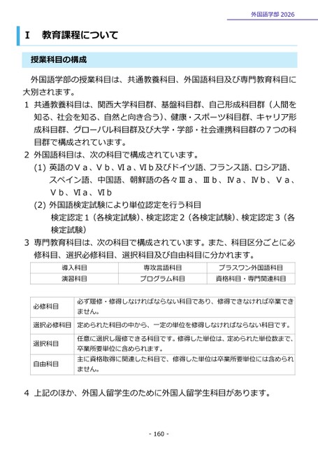 Ⅰ教育課程について授業科目の構成外国語学部2026外国語学部の授業科目は、共通教養科目、外国語科目及び専門教育科目に大別されます。1共通教養科目は、関西大学科目群、基盤科目群、自己形成科目群(人間を知る、社会を知る、自然と向き合う)、健康・スポーツ科目群、キャリア形成科目群、グローバル科目群及び大学・学部・社会連携科目群の7つの科目群で構成されています。2外国語科目は、次の科目で構成されています。(1)英語のⅤa、Ⅴb、Ⅵa、Ⅵb及びドイツ語、フランス語、ロシア語、スペイン語、中国語、朝鮮語の各々Ⅲa、Ⅲb、Ⅳa、Ⅳb、Ⅴa、Ⅴb、Ⅵa、Ⅵb(2)外国語検定試験により単位認定を行う科目検定認定1(各検定試験)、検定認定2(各検定試験)、検定認定3(各検定試験)3専門教育科目は、次の科目で構成されています。また、科目区分ごとに必修科目、選択必修科目、選択科目及び自由科目に分かれます。導入科目演習科目専攻言語科目プログラム科目プラスワン外国語科目資格科目・専門関連科目必ず履修・修得しなければならない科目であり、修得できなければ卒業できません。修科目必選択必修科目定められた科目の中から、一定の単位を修得しなければならない科目です。任意に選択し履修できる科目です。修得した単位は、定められた単位数まで、卒業所要単位に含められます。主に資格取得に関連した科目で、修得した単位は卒業所要単位には含められません。選択科目自由科目4上記のほか、外国人留学生のために外国人留学生科目があります。-160-