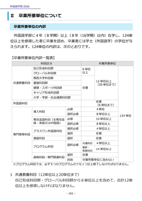 外国語学部2026Ⅱ卒業所要単位について卒業所要単位の内訳外国語学部に4年〈8学期〉以上(8年〈16学期〉以内)在学し、124単位以上を修得した者に卒業を認め、卒業者には学士(外国語学)の学位が与えられます。124単位の内訳は、次のとおりです。【卒業所要単位内訳一覧表】24単位1共通教養科目外国語科目専門教育科目科目区分自己形成科目群グローバル科目群関西大学科目群基盤科目群健康・スポーツ科目群キャリア形成科目群大学・学部・社会連携科目群導入科目専攻言語科目〔主専攻言語:英語又は中国語〕プラスワン外国語科目演習科目プログラム科目資格科目・専門関連科目必修選択必修必修選択必修選択必修選択選択選択必修選択自由6単位以上任意卒業所要単位12単位以上(20単位まで)任意(6単位まで)4単位8単位以上10単位以上8単位以上4単位以上任意任意4単位以上14単位以上共通科目基幹・発展科目任意卒業所要単位に含めない※プログラム科目では、必ず5つのプログラムのうち1つ以上修了しなければなりません。1共通教養科目(12単位以上20単位まで)自己形成科目群・グローバル科目群から6単位以上を含めて、合計12単位以上を修得しなければなりません。-161-