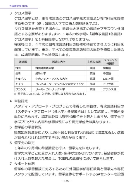 外国語学部20263クロス留学クロス留学とは、主専攻言語とクロス留学先の言語及び専門科目を履修するものです(例:韓国の大学で英語と朝鮮語を学ぶ)。クロス留学を希望する場合は、派遣先大学指定の言語をプラスワン外国語とする必要があります。また、1年次の秋学期に「副専攻言語(各言語)クロス留学」を1科目履修しなければなりません。帰国後は3、4年次に副専攻言語科目の履修を持続できるように科目を配置しています。また、すべての副専攻言語科目の単位を修得した場合は、成績証明書にその旨記載します。派遣国韓国台湾キルギスドイツフランス派遣先大学主専攻言語韓国外国語大学成功大学中央アジア・アメリカ大学ヨハネス・グーテンベルク大学マインツリール・カトリック大学英語英語英語英語英語プラスワン外国語朝鮮語中国語ロシア語ドイツ語フランス語※留学先については、入学後、変更になる場合もあります。4単位認定スタディ・アブロード・プログラムで修得した単位は、専攻言語科目の「スタディ・アブロード(各大学)各授業科目」として認定し、卒業所要単位に含めます。認定単位数は原則40単位を上限としますが、留学先で学ぶプログラム内容や修得状況により認定単位数は異なります。5留学前の学習状況授業出席調査等により、出席不良と判断される場合には注意を促し、改善が見られなければ留学できない場合があります。6留学先の決定1年次の9月頃に希望調査を行い、留学先を決定します。留学先大学ごとに受け入れ人数・条件が定められています。希望者数が受け入れ人数を超えた場合は、TOEFLの成績等において選考します。7サポート体制留学中の学習相談に対応するために外国語学部専任教員と留学先の専従スタッフを配置しています。留学全体をサポートするSAセンターも設置-165-