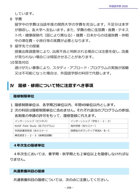 しています。8学費外国語学部2026留学中の学費は当該年度の関西大学の学費を充当します。不足分は本学が徴収し、各大学へ支払います。また、学費の他に住居費・食費・テキスト代・健康保険代(国により異なる)・雑費・日本からの往復旅費・休暇中の滞在費・小旅行等の実費が必要となります。9留学先での授業授業出席調査等により、出席不良と判断される場合には注意を促し、改善が見られない場合には帰国させることがあります。10緊急対応避けがたい事象により、スタディ・アブロード・プログラムの実施が困難又は不可能になった場合は、外国語学部の科目で代替します。Ⅳ履修・修得について特に注意すべき事項履修制限単位1履修制限単位は、各学期25単位以内、年間49単位以内とします。2次の科目は履修制限単位に含めません。それぞれ該当のプログラムの参加、各制度の申請の許可をもって、履修登録に代えます。インターンシップ(ビジネス)インターンシップ(学校1・2・3)KUGFFieldStudy(各プログラム)海外研修(各セミナー)外国語運用実習(各セミナー)国際協力ボランティア実習A・B・C検定認定1・2・3(各検定試験)4年次生の履修単位4年次生においては、春学期・秋学期とも2単位以上を履修しなければな共通教養科目の履修については、次の点に注意してください。-166-通教養科目の履修共りません。