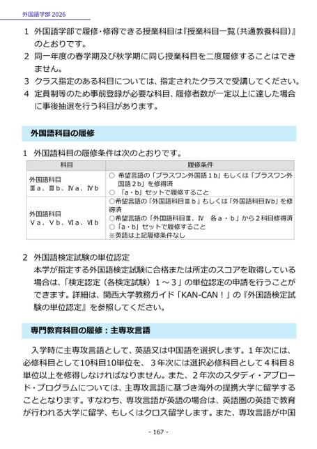 履修条件外国語学部20261外国語学部で履修・修得できる授業科目は『授業科目一覧(共通教養科目)』のとおりです。2同一年度の春学期及び秋学期に同じ授業科目を二度履修することはできません。3クラス指定のある科目については、指定されたクラスで受講してください。4定員制等のため事前登録が必要な科目、履修者数が一定以上に達した場合に事後抽選を行う科目があります。国語科目の履修外1外国語科目の履修条件は次のとおりです。科目外国語科目Ⅲa、Ⅲb、Ⅳa、Ⅳb外国語科目Ⅴa、Ⅴb、Ⅵa、Ⅵb○希望言語の「プラスワン外国語1b」もしくは「プラスワン外国語2b」を修得済○「a・b」セットで履修すること○希望言語の「外国語科目Ⅲb」もしくは「外国語科目Ⅳb」を修得済○希望言語の「外国語科目Ⅲ、Ⅳ○「a・b」セットで履修すること※英語は上記履修条件なし各a・b」から2科目修得済外国語検定試験の単位認定本学が指定する外国語検定試験に合格または所定のスコアを取得している場合は、「検定認定(各検定試験)1~3」の単位認定の申請を行うことができます。詳細は、関西大学教務ガイド「KAN-CAN!」の『外国語検定試験の単位認定』を参照してください。2専門教育科目の履修:主専攻言語入学時に主専攻言語として、英語又は中国語を選択します。1年次には、必修科目として10科目10単位を、3年次には選択必修科目として4科目8単位以上を修得しなければなりません。また、2年次のスタディ・アブロード・プログラムについては、主専攻言語に基づき海外の提携大学に留学することとなります。すなわち、専攻言語が英語の場合は、英語圏の英語で教育が行われる大学に留学、もしくはクロス留学します。また、専攻言語が中国-167-