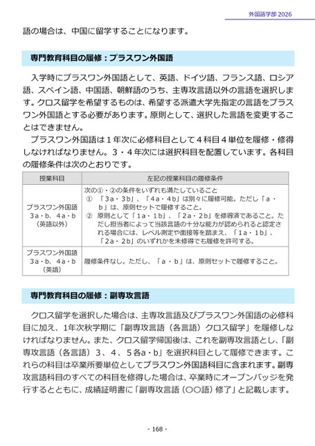 外国語学部2026語の場合は、中国に留学することになります。門教育科目の履修:プラスワン外国語専入学時にプラスワン外国語として、英語、ドイツ語、フランス語、ロシア語、スペイン語、中国語、朝鮮語のうち、主専攻言語以外の言語を選択します。クロス留学を希望するものは、希望する派遣大学先指定の言語をプラスワン外国語とする必要があります。原則として、選択した言語を変更することはできません。プラスワン外国語は1年次に必修科目として4科目4単位を履修・修得しなければなりません。3・4年次には選択科目を配置しています。各科目の履修条件は次のとおりです。授業科目左記の授業科目の履修条件次の①・②の条件をいずれも満たしていること①「3a・3b」、「4a・4b」は別々に履修可能。ただし「a・b」は、原則セットで履修すること。②原則として「1a・1b」、「2a・2b」を修得済であること。ただし担当者によって当該言語の十分な能力が認められると認定される場合には、レベル測定や面接等を踏まえ、「1a・1b」、「2a・2b」のいずれかを未修得でも履修を許可する。履修条件なし。ただし、「a・b」は、原則セットで履修すること。プラスワン外国語3a・b、4a・b(英語以外)プラスワン外国語3a・b、4a・b(英語)クロス留学を選択した場合は、主専攻言語及びプラスワン外国語の必修科目に加え、1年次秋学期に「副専攻言語(各言語)クロス留学」を履修しなければなりません。また、クロス留学帰国後は、これを副専攻言語とし、「副専攻言語(各言語)3、4、5各a・b」を選択科目として履修できます。これらの科目は卒業所要単位としてプラスワン外国語科目に含まれます。副専攻言語科目のすべての科目を修得した場合は、卒業時にオープンバッジを発行するとともに、成績証明書に「副専攻言語(〇〇語)修了」と記載します。門教育科目の履修:副専攻言語専-168-