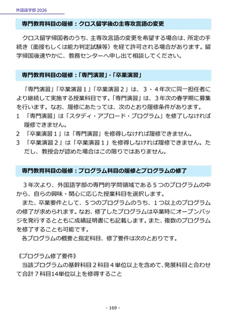 クロス留学帰国者のうち、主専攻言語の変更を希望する場合は、所定の手続き(面接もしくは能力判定試験等)を経て許可される場合があります。留学帰国後速やかに、教務センターへ申し出て相談してください。門教育科目の履修:「専門演習」・「卒業演習」専専門教育科目の履修:クロス留学後の主専攻言語の変更外国語学部2026「専門演習」「卒業演習1」「卒業演習2」は、3・4年次に同一担任者により継続して実施する授業科目です。「専門演習」は、3年次の春学期に募集を行います。なお、履修にあたっては、次のとおり履修条件があります。1「専門演習」は「スタディ・アブロード・プログラム」を修了しなければ履修できません。「卒業演習1」は「専門演習」を修得しなければ履修できません。23「卒業演習2」は「卒業演習1」を修得しなければ履修できません。た3年次より、外国語学部の専門的学問領域である5つのプログラムの中から、自らの興味・関心に応じた授業科目を選択します。また、卒業要件として、5つのプログラムのうち、1つ以上のプログラムの修了が求められます。なお、修了したプログラムは卒業時にオープンバッジを発行するとともに成績証明書にも記載します。また、複数のプログラムを修了することも可能です。各プログラムの概要と指定科目、修了要件は次のとおりです。プログラム修了要件》当該プログラムの基幹科目2科目4単位以上を含めて、発展科目と合わせ《て合計7科目14単位以上を修得すること門教育科目の履修:プログラム科目の履修とプログラムの修了専だし、教授会が認めた場合はこの限りではありません。-169-