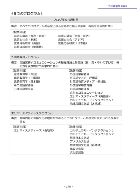 《5つのプログラム》外国語学部2026概要:すべてのプログラムの基盤となる言語の仕組みや意味、機能を系統的に学ぶプログラム共通科目(授業科目)言語の構造(音声・音韻)言語と社会(欧米)言語分析研究(英語)言語分析研究(中国語)外国語教育プログラム言語の構造(意味・談話)言語と社会(アジア)言語分析研究(日本語)概要:言語習得やコミュニケーションの基礎理論と外国語(日・英・中)の学び方、教え方を実践的かつ科学的に学ぶ(基幹科目)言語教育学(英語)言語教育学(中国語)言語教育学(日本語)第二言語習得論心理言語学研究(発展科目)外国語学習者論外国語テスト・評価論外国語教育メディア・教材論外国語早期教育論日本語教育演習文化とコミュニケーションエリア・スタディーズ(英語圏)カルチュラル・インタラクション1地域言語文化論(各地域)エリア・スタディーズプログラム概要:地域固有の言語文化の理解を深めるとともにグローバル社会に求められる視点を得る(基幹科目)エリア・スタディーズ(各地域)(発展科目)カルチュラル・インタラクション1カルチュラル・インタラクション2現代日本文化論アメリカ文化論地域言語文化論(各地域)比較文化論文化翻訳論-170-
