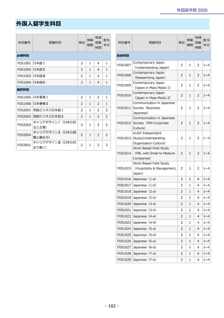 外国人留学生科目科目番号授業科目必修科目FOS1001日本語ⅠFOS1002日本語ⅡFOS1003日本語ⅢFOS1004日本語Ⅳ選択科目FOS1005日本事情ⅠFOS1006日本事情ⅡFOS2001実践ビジネス日本語ⅠFOS2002FOS2003FOS2004FOS3001実践ビジネス日本語ⅡキャリアデザインⅠ(日本の社会と企業)キャリアデザインⅡ(日本の就職と働き方)キャリアデザインⅢ(日本の社会で働く)外国語学部2026単位授業期間毎週授業時間配当年次科目番号授業科目単位授業期間毎週授業時間配当年次22222222222111111111114444222222211111122223自由科目FOS1007FOS1008FOS1009FOS1010FOS1011FOS1012FOS1013FOS1014FOS1015FOS1016ContemporaryJapan(UnderstandingJapan)ContemporaryJapan(ResearchingJapan)ContemporaryJapan(JapaninMassMedia1)ContemporaryJapan(JapaninMassMedia2)CommunicationinJapaneseSociety(BusinessJapanese)CommunicationinJapaneseSociety(JPNCorporateCulture)KUGFIndependentStudy(UnderstandingOrganizationCulture)Work-BasedFieldStudy(PBLwithSmalltoMediumCompanies)Work-BasedFieldStudy(Hospitality&Management,Japan)Japanese(1-a)FOS1017Japanese(1-b)FOS1018Japanese(2-a)FOS1019Japanese(2-b)FOS1020Japanese(3-a)FOS1021Japanese(3-b)FOS1022Japanese(4-a)FOS1023Japanese(4-b)FOS1024Japanese(5-a)FOS1025Japanese(5-b)FOS1026Japanese(6-a)FOS1027Japanese(6-b)FOS1028Japanese(7-a)FOS1029Japanese(7-b)2222222222222222222222211111111111111111111111222221~41~41~41~41~421~421~421~42444444444444441~41~41~41~41~41~41~41~41~41~41~41~41~41~41~4-182-