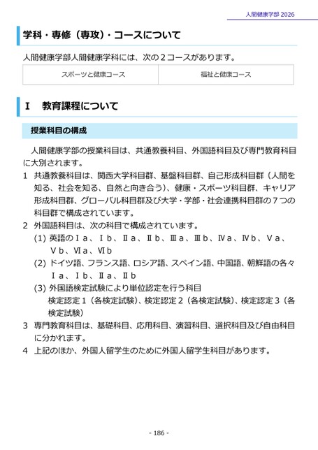 学科・専修(専攻)・コースについて人間健康学部2026人間健康学部人間健康学科には、次の2コースがあります。スポーツと健康コース福祉と健康コース教育課程についてⅠ授業科目の構成人間健康学部の授業科目は、共通教養科目、外国語科目及び専門教育科目に大別されます。1共通教養科目は、関西大学科目群、基盤科目群、自己形成科目群(人間を知る、社会を知る、自然と向き合う)、健康・スポーツ科目群、キャリア形成科目群、グローバル科目群及び大学・学部・社会連携科目群の7つの科目群で構成されています。2外国語科目は、次の科目で構成されています。(1)英語のⅠa、Ⅰb、Ⅱa、Ⅱb、Ⅲa、Ⅲb、Ⅳa、Ⅳb、Ⅴa、Ⅴb、Ⅵa、Ⅵb(2)ドイツ語、フランス語、ロシア語、スペイン語、中国語、朝鮮語の各々Ⅰa、Ⅰb、Ⅱa、Ⅱb(3)外国語検定試験により単位認定を行う科目検定認定1(各検定試験)、検定認定2(各検定試験)、検定認定3(各検定試験)3専門教育科目は、基礎科目、応用科目、演習科目、選択科目及び自由科目に分かれます。4上記のほか、外国人留学生のために外国人留学生科目があります。-186-