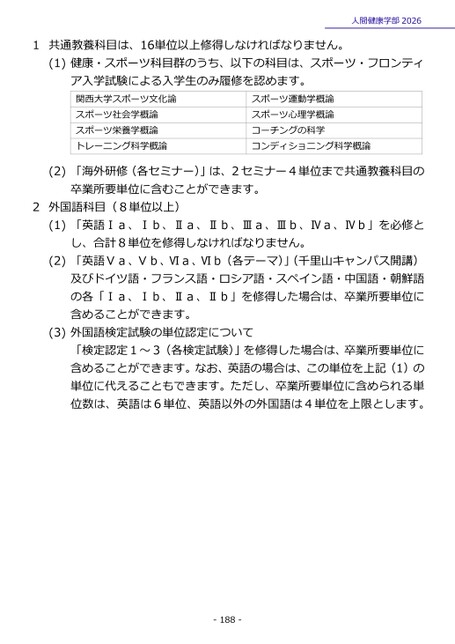 1共通教養科目は、16単位以上修得しなければなりません。人間健康学部2026(1)健康・スポーツ科目群のうち、以下の科目は、スポーツ・フロンティア入学試験による入学生のみ履修を認めます。関西大学スポーツ文化論スポーツ社会学概論スポーツ栄養学概論トレーニング科学概論スポーツ運動学概論スポーツ心理学概論コーチングの科学コンディショニング科学概論(2)「海外研修(各セミナー)」は、2セミナー4単位まで共通教養科目の卒業所要単位に含むことができます。2外国語科目(8単位以上)(1)「英語Ⅰa、Ⅰb、Ⅱa、Ⅱb、Ⅲa、Ⅲb、Ⅳa、Ⅳb」を必修とし、合計8単位を修得しなければなりません。(2)「英語Ⅴa、Ⅴb、Ⅵa、Ⅵb(各テーマ)」(千里山キャンパス開講)及びドイツ語・フランス語・ロシア語・スペイン語・中国語・朝鮮語の各「Ⅰa、Ⅰb、Ⅱa、Ⅱb」を修得した場合は、卒業所要単位に含めることができます。(3)外国語検定試験の単位認定について「検定認定1~3(各検定試験)」を修得した場合は、卒業所要単位に含めることができます。なお、英語の場合は、この単位を上記(1)の単位に代えることもできます。ただし、卒業所要単位に含められる単位数は、英語は6単位、英語以外の外国語は4単位を上限とします。-188-