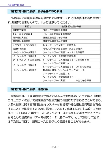 人間健康学部2026専門教育科目の履修:履修条件のある科目次の科目には履修条件が附帯されています。それぞれの要件を満たさなければ履修できませんので、十分に注意してください。科目名運動処方実習トレーニング実習Ⅱ健康運動実習Ⅱ健康運動指導演習レクリエーション実技Ⅱ増健科学演習ソーシャルワーク演習Ⅱソーシャルワーク演習Ⅲソーシャルワーク実習指導Ⅱソーシャルワーク実習Ⅰソーシャルワーク実習Ⅱ左記科目の履修条件スポーツ生理学を修得済トレーニング実習Ⅰを修得済健康運動実習Ⅰを修得済健康運動実習Ⅱを修得済レクリエーション実技Ⅰを修得済地域スポーツ演習を履修中または修得済ソーシャルワーク演習Ⅰa・Ⅰbを修得済ソーシャルワーク演習Ⅱを修得済ソーシャルワーク実習指導Ⅰa・Ⅰbを修得済ソーシャルワーク演習Ⅰa、ソーシャルワーク実習指導Ⅰaいずれも修得済社会福祉概論、ソーシャルワーク論Ⅰ・Ⅱ、ソーシャルワーク演習Ⅰb、ソーシャルワーク実習指導Ⅰb、ソーシャルワーク実習Ⅰの全てを修得済連携科目は、人間健康学部が掲げている人材養成像のひとつである「地域コミュニティにおいて健康支援や生活支援の実践にたずさわることができる、人間の健康に関する専門性を持つスポーツ指導者や社会福祉専門職者を育成すること」を具現化するために開設しています。具体的には、「スポーツと健康コース」「福祉と健康コース」の2つのコースを有機的に連携させることを目的とした連携科目「テーマ研究Ⅰ・Ⅱ(各テーマ)」として開設しており、2年次配当科目で、所属コースに関係なく受講することができます。門教育科目の履修:連携科目専-193-