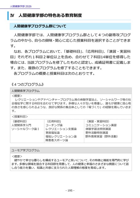 人間健康学部2026Ⅳ人間健康学部の特色ある教育制度人間健康学プログラム群について人間健康学部では、人間健康学プログラム群として4つの副専攻プログラムの中から、自らの興味・関心に応じた授業科目を選択することができます。なお、各プログラムにおいて、「基礎科目」、「応用科目」、「演習・実習科目」それぞれ1科目2単位以上を含め、合わせて7科目14単位を修得した場合には、当該プログラムを修了したものと認定し、成績証明書に記載します。また、複数のプログラムを修了することもできます。各プログラムの概要と授業科目は次のとおりです。《4つのプログラム》人間関係学プログラム<概要>レクリエーションやアドベンチャープログラム等の体験学習法と、ソーシャルワーク等の社会福祉学に関する科目を合わせて学びます。多様な人々が互いを尊重し、誰もが健康に居心地の良さを感じられるような、良好な関係の集合体としての「場づくり」の経験を積んでいきます。<授業科目>(基礎科目)人間関係学入門ソーシャルワーク論Ⅰ(演習・実習科目)コミュニケーション演習体験学習法特別演習野外活動特別演習野外教育実習(野外活動)(応用科目)コーチング論レクリエーション支援論家族福祉論福祉レクリエーション論障害者スポーツ論ユーモア学プログラム<概要>健やかで幸せな暮らしを構成するユーモアと笑いについて、その特徴と機能を専門的に学びます。多様な領域を接合する科目群を用意して、人の健康と幸福のさまざまな側面について話し合う能力を養い、知識と共感に支えられた人間理解の態度を育成します。-195-