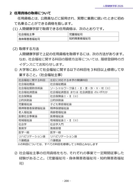 任用資格とは、公務員などに採用され、実際に業務に就いたときに初めて名乗ることができる資格を指します。(1)人間健康学部で取得できる任用資格は、次のとおりです。人間健康学部で上記の任用資格を取得するには、次の方法があります。なお、社会福祉に関する科目の履修方法等については、履修登録時のガイダンスにてお知らせします。①大学等において社会福祉に関する以下の科目を3科目以上修得して卒児童福祉司知的障害者福祉司社会福祉主事身体障害者福祉司2)取得する方法(2任用資格の取得について人間健康学部2026業すること。(社会福祉主事)社会福祉に関する科目社会福祉概論社会福祉援助技術論社会福祉調査論社会保障論公的扶助論児童福祉論精神障害者保健福祉論老人福祉論医療社会事業論地域福祉論社会学教育学医学一般リハビリテーション論介護概論※の科目については、すべての科目を修得して1科目とみなします左記に対応する本学の開講科目社会福祉概論ソーシャルワーク論Ⅰ・Ⅱ・Ⅲ・Ⅳ・Ⅴ・Ⅵ(※)社会福祉調査法または社会調査法のいずれか社会保障論Ⅰ・Ⅱ(※)公的扶助論子ども家庭福祉論精神保健福祉論高齢者福祉論医療福祉論地域福祉論Ⅰ・Ⅱ(※)社会学入門教育原理医学一般リハビリテーション論介護概論②社会福祉主事の任用資格をもち、それぞれの事業で一定期間従事した経験があること。(児童福祉司・身体障害者福祉司・知的障害者福祉司)-200-