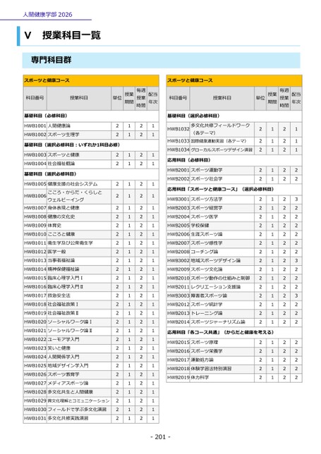 1112232222223222322222222基礎科目(選択必修科目)HWB1032多文化共修フィールドワーク(各テーマ)HWB1033国際健康運動実習(各テーマ)HWB1034グローカルスポーツデザイン演習応用科目(必修科目)HWB2001スポーツ運動学HWB2002スポーツ社会学2222211111応用科目「スポーツと健康コース」(選択必修科目)HWB3001スポーツ方法学HWB2003スポーツ経営学HWB2004スポーツ医学HWB2005学校保健HWB2006生涯スポーツ論HWB2007スポーツ感性学HWB2008コーチング論HWB3002地域スポーツデザイン論HWB2009スポーツ文化論HWB2010スポーツ動作の仕組みと制御HWB2011レクリエーション支援論HWB3003障害者スポーツ論HWB2012スポーツ統計学HWB2013トレーニング論HWB2014スポーツジャーナリズム論222222222222222111111111111111応用科目「各コース共通」(からだと健康を考える)HWB2015スポーツ原理HWB2016スポーツ栄養学HWB2017運動処方論HWB2018体験学習法特別演習HWB2019体力科学22222111112222222222222222222222222111111111111111111111111111111122222222222222222222222222222221111111111111111111111111111111単位授業期間毎週授業時間配当年次スポーツと健康コース科目番号授業科目単位授業期間毎週授業時間配当年次人間健康学部2026Ⅴ授業科目一覧専門科目群スポーツと健康コース科目番号授業科目基礎科目(必修科目)HWB1001人間健康論HWB1002スポーツ生理学22基礎科目(選択必修科目:いずれか1科目必修)HWB1003スポーツと健康HWB1004社会福祉概論基礎科目(選択必修科目)HWB1005健康支援の社会システムHWB1006こころ・からだ・くらしとウェルビーイングHWB1007身体表現と健康HWB1008健康の文化史HWB1009体育史HWB1010こころと健康HWB1011衛生学及び公衆衛生学HWB1012医学一般HWB1013当事者福祉論HWB1014精神保健福祉論HWB1015臨床心理学入門ⅠHWB1016臨床心理学入門ⅡHWB1017救急安全法HWB1018社会福祉政策ⅠHWB1019社会福祉政策ⅡHWB1020ソーシャルワーク論ⅠHWB1021ソーシャルワーク論ⅡHWB1022ユーモア学入門HWB1023笑いと健康HWB1024人間関係学入門HWB1025地域デザイン学入門HWB1026スポーツ教育学HWB1027メディアスポーツ論HWB1028多文化共生と人間健康HWB1029異文化理解とコミュニケーションHWB1030フィールドで学ぶ多文化演習HWB1031多文化共修実践演習22222222222222222222222222222-201-