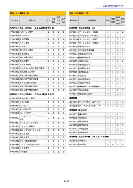 -202-人間健康学部2026スポーツと健康コース科目番号授業科目単位期間授業授業毎週時間年次配当応用科目「各コース共通」(こころと健康を考える)HWB2020スポーツ心理学2122HWB2021身心教育学2122HWB2022身体表現論2122HWB3004身体文化論2123HWB2023武道論2122HWB2024学びの身心技法2122HWB3005心理学演習2123HWB2025福祉臨床心理学2122HWB2026生殖心理学2122HWB2027共感と多様性2122HWB2028メンタルヘルスと臨床心理学2122HWB2029地域支援と心理学2122HWB2030臨床心理学特定課題Ⅰ2122HWB2031臨床心理学特定課題Ⅱ2122HWB3006子育て支援の心理学2123HWB3007臨床心理学特定課題Ⅲ2123HWB3008臨床心理学特定課題Ⅳ2123応用科目「各コース共通」(くらしと健康を考える)HWB2032身体の文化人類学2122HWB2033人間行動論2122HWB2034笑いの文学2122HWB2035笑いの民俗学2122HWB2036笑いの行動学2122HWB3009ユーモアコミュニケーション演習2123HWB2037リハビリテーション論2122HWB2038フィールド調査法2122HWB3010福祉レクリエーション論2123HWB2039家族福祉論2122HWB2040臨床死生学2122HWB3011老人・障害者の理解2123HWB2041コミュニケーション演習2122HWB2042社会調査法2122HWB2043介護概論2122スポーツと健康コース科目番号授業科目単位期間授業授業毎週時間年次配当応用科目「福祉と健康コース」HWB2044ソーシャルワーク論Ⅲ2122HWB2045ソーシャルワーク論Ⅳ2122HWB2046ソーシャルワーク論Ⅴ2122HWB2047ソーシャルワーク論Ⅵ2122HWB2048高齢者福祉論2122HWB2049子ども家庭福祉論2122HWB3012社会福祉経営論2123HWB2050障害者福祉論2122HWB2051公的扶助論2122HWB2052地域福祉論Ⅰ2122HWB2053地域福祉論Ⅱ2122HWB2054医療福祉論2122HWB3013司法福祉2123HWB3014社会保障論Ⅰ2123HWB3015社会保障論Ⅱ2123HWB3016権利擁護と成年後見制度2123HWB3017社会起業論2123HWB3018社会福祉調査法2123連携科目HWB2055テーマ研究Ⅰ(各テーマ)2122HWB2056テーマ研究Ⅱ(各テーマ)2122演習科目(必修科目)HWB1035導入演習2121HWB2057基礎演習2122HWB3019専門演習Ⅰ2123HWB3020専門演習Ⅱ2123HWB4001卒業演習Ⅰ2124HWB4002卒業演習Ⅱ2124演習科目(選択必修科目:いずれか1科目必修)HWB4003卒業論文4ーー4HWB4004卒業研究4ーー4