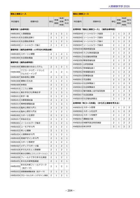 -204-人間健康学部2026福祉と健康コース科目番号授業科目単位期間授業授業毎週時間年次配当基礎科目(必修科目)HWB1001人間健康論2121HWB1018社会福祉政策Ⅰ2121HWB1019社会福祉政策Ⅱ2121HWB1020ソーシャルワーク論Ⅰ2121基礎科目(選択必修科目:いずれか1科目必修)HWB1003スポーツと健康2121HWB1004社会福祉概論2121基礎科目(選択必修科目)HWB1005健康支援の社会システム2121HWB1006こころ・からだ・くらしとウェルビーイング2121HWB1007身体表現と健康2121HWB1008健康の文化史2121HWB1009体育史2121HWB1010こころと健康2121HWB1011衛生学及び公衆衛生学2121HWB1012医学一般2121HWB1013当事者福祉論2121HWB1014精神保健福祉論2121HWB1015臨床心理学入門Ⅰ2121HWB1016臨床心理学入門Ⅱ2121HWB1002スポーツ生理学2121HWB1017救急安全法2121HWB1021ソーシャルワーク論Ⅱ2121HWB1022ユーモア学入門2121HWB1023笑いと健康2121HWB1024人間関係学入門2121HWB1025地域デザイン学入門2121HWB1026スポーツ教育学2121HWB1027メディアスポーツ論2121HWB1028多文化共生と人間健康2121HWB1029異文化理解とコミュニケーション2121HWB1030フィールドで学ぶ多文化演習2121HWB1031多文化共修実践演習2121HWB1032多文化共修フィールドワーク(各テーマ)2121HWB1033国際健康運動実習(各テーマ)2121HWB1034グローカルスポーツデザイン演習2121福祉と健康コース科目番号授業科目単位期間授業授業毎週時間年次配当応用科目「福祉と健康コース」(選択必修科目)HWB2044ソーシャルワーク論Ⅲ2122HWB2045ソーシャルワーク論Ⅳ2122HWB2046ソーシャルワーク論Ⅴ2122HWB2047ソーシャルワーク論Ⅵ2122HWB2048高齢者福祉論2122HWB2049子ども家庭福祉論2122HWB3012社会福祉経営論2123HWB2050障害者福祉論2122HWB2051公的扶助論2122HWB2052地域福祉論Ⅰ2122HWB2053地域福祉論Ⅱ2122HWB2054医療福祉論2122HWB3013司法福祉2123HWB3014社会保障論Ⅰ2123HWB3015社会保障論Ⅱ2123HWB3016権利擁護と成年後見制度2123HWB3017社会起業論2123HWB3018社会福祉調査法2123応用科目「各コース共通」(からだと健康を考える)HWB2015スポーツ原理2122HWB2002スポーツ社会学2122HWB2016スポーツ栄養学2122HWB2017運動処方論2122HWB2018体験学習法特別演習2122HWB2019体力科学2122