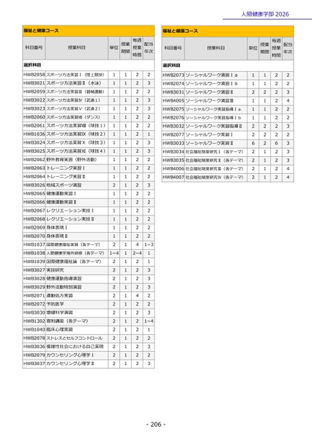 福祉と健康コース科目番号授業科目単位授業期間毎週授業時間配当年次福祉と健康コース科目番号授業科目人間健康学部2026単位授業期間毎週授業時間配当年次112111222111122222222622222234223233344選択科目HWB2073ソーシャルワーク演習ⅠaHWB2074ソーシャルワーク演習ⅠbHWB3031ソーシャルワーク演習ⅡHWB4005ソーシャルワーク演習ⅢHWB2075ソーシャルワーク実習指導ⅠaHWB2076ソーシャルワーク実習指導ⅠbHWB3032ソーシャルワーク実習指導ⅡHWB2077ソーシャルワーク実習ⅠHWB3033ソーシャルワーク実習ⅡHWB3034社会福祉制度研究Ⅰ(各テーマ)HWB3035社会福祉制度研究Ⅱ(各テーマ)HWB4006社会福祉制度研究Ⅲ(各テーマ)HWB4007社会福祉制度研究Ⅳ(各テーマ)1121112262222選択科目HWB2058スポーツ方法実習Ⅰ(陸上競技)HWB3021スポーツ方法実習Ⅱ(水泳)HWB2059スポーツ方法実習Ⅲ(器械運動)HWB3022スポーツ方法実習Ⅳ(武道1)HWB3023スポーツ方法実習Ⅴ(武道2)HWB2060スポーツ方法実習Ⅶ(ダンス)HWB2061スポーツ方法実習Ⅷ(球技1)HWB1036スポーツ方法実習Ⅸ(球技2)HWB3024スポーツ方法実習Ⅹ(球技3)HWB3025スポーツ方法実習Ⅺ(球技4)HWB2062野外教育実習(野外活動)HWB2063トレーニング実習ⅠHWB2064トレーニング実習ⅡHWB3026地域スポーツ演習HWB2065健康運動実習ⅠHWB2066健康運動実習ⅡHWB2067レクリエーション実技ⅠHWB2068レクリエーション実技ⅡHWB2069身体表現ⅠHWB2070身体表現ⅡHWB1037国際健康福祉実習(各テーマ)111111111111121111112HWB1038人間健康学海外研修(各テーマ)1~4HWB1039国際健康福祉論(各テーマ)HWB3027実技研究HWB3028健康運動指導演習HWB3029野外活動特別演習HWB2071運動処方実習HWB2072予防医学HWB3030増健科学演習HWB1302寄附講座(各テーマ)HWB1040臨床心理実習HWB2078ストレスとセルフコントロールHWB3036複雑性社会における自己実現HWB2079カウンセリング心理学ⅠHWB3037カウンセリング心理学Ⅱ2222222222222111111111111111111111111111111111112222222222222222222242~42222422222222232332213322232222221~3113332231~412323-206-