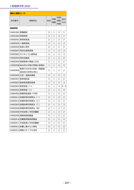 単位授業期間毎週授業時間配当年次222221222122212222222222222111111111111111111111111111222222222222224422222222222112223322323233・4442233222222-207-人間健康学部2026福祉と健康コース科目番号授業科目自由科目HWB1901教職概説HWB1902教育原理HWB2901教育制度論HWB2902人権教育論HWB2903教育心理学HWB3907特別支援教育論HWB3901カリキュラム開発論HWB2904特別活動論HWB2905道徳教育の理論と方法HWB3908総合的な学習の時間の指導法教育の方法及び技術(情報通信技術の活用を含む)HWB2906HWB3902生徒・進路指導論HWB2907教育相談論HWB3903教育実習事前指導HWB3904教育実習(一)HWB4901教育実習(二)HWB4902教職実践演習(中等)HWB2914保健体育科教育法(一)HWB2915保健体育科教育法(二)HWB3905保健体育科教育法(三)HWB3906保健体育科教育法(四)HWB2908学校経営と学校図書館HWB2909情報資源組織論HWB2910図書館情報資源概論HWB2911学習指導と学校図書館HWB2912読書と豊かな人間性HWB2913情報メディアの活用