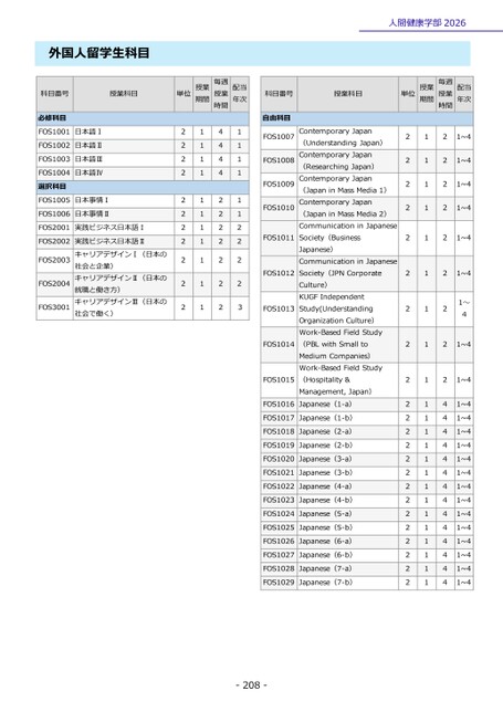 科目番号授業科目自由科目FOS1007FOS1008FOS1009FOS1010FOS1011FOS1012FOS1013FOS1014FOS1015FOS1016ContemporaryJapan(UnderstandingJapan)ContemporaryJapan(ResearchingJapan)ContemporaryJapan(JapaninMassMedia1)ContemporaryJapan(JapaninMassMedia2)CommunicationinJapaneseSociety(BusinessJapanese)CommunicationinJapaneseSociety(JPNCorporateCulture)KUGFIndependentStudy(UnderstandingOrganizationCulture)Work-BasedFieldStudy(PBLwithSmalltoMediumCompanies)Work-BasedFieldStudy(Hospitality&Management,Japan)Japanese(1-a)FOS1017Japanese(1-b)FOS1018Japanese(2-a)FOS1019Japanese(2-b)FOS1020Japanese(3-a)FOS1021Japanese(3-b)FOS1022Japanese(4-a)FOS1023Japanese(4-b)FOS1024Japanese(5-a)FOS1025Japanese(5-b)FOS1026Japanese(6-a)FOS1027Japanese(6-b)FOS1028Japanese(7-a)FOS1029Japanese(7-b)単位授業期間毎週授業時間配当年次2222222222222222222222211111111111111111111111222221~41~41~41~41~421~421~421~42444444444444441~41~41~41~41~41~41~41~41~41~41~41~41~41~41~4-208-人間健康学部2026外国人留学生科目科目番号授業科目必修科目FOS1001日本語ⅠFOS1002日本語ⅡFOS1003日本語ⅢFOS1004日本語Ⅳ選択科目FOS1005日本事情ⅠFOS1006日本事情ⅡFOS2001実践ビジネス日本語ⅠFOS2002FOS2003FOS2004FOS3001実践ビジネス日本語ⅡキャリアデザインⅠ(日本の社会と企業)キャリアデザインⅡ(日本の就職と働き方)キャリアデザインⅢ(日本の社会で働く)単位授業期間毎週授業時間配当年次22222222222111111111114444222222211111122223