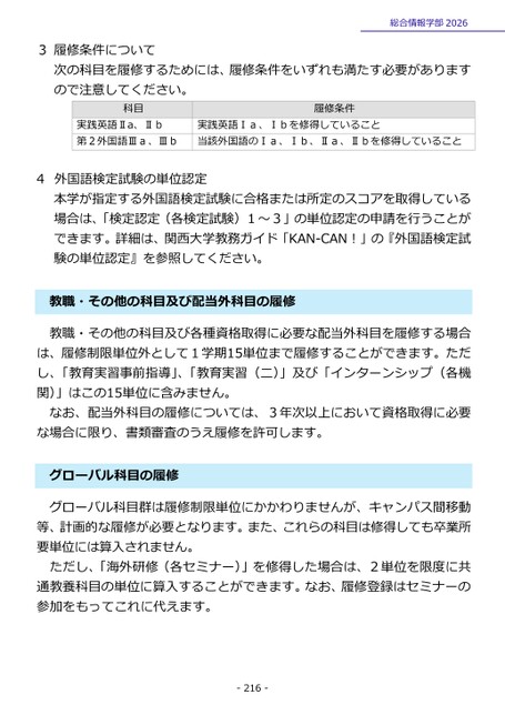 3履修条件について総合情報学部2026次の科目を履修するためには、履修条件をいずれも満たす必要がありますので注意してください。科目履修条件実践英語Ⅱa、Ⅱb第2外国語Ⅲa、Ⅲb実践英語Ⅰa、Ⅰbを修得していること当該外国語のⅠa、Ⅰb、Ⅱa、Ⅱbを修得していること外国語検定試験の単位認定本学が指定する外国語検定試験に合格または所定のスコアを取得している場合は、「検定認定(各検定試験)1~3」の単位認定の申請を行うことができます。詳細は、関西大学教務ガイド「KAN-CAN!」の『外国語検定試験の単位認定』を参照してください。4教職・その他の科目及び配当外科目の履修教職・その他の科目及び各種資格取得に必要な配当外科目を履修する場合は、履修制限単位外として1学期15単位まで履修することができます。ただし、「教育実習事前指導」、「教育実習(二)」及び「インターンシップ(各機関)」はこの15単位に含みません。なお、配当外科目の履修については、3年次以上において資格取得に必要な場合に限り、書類審査のうえ履修を許可します。グローバル科目の履修グローバル科目群は履修制限単位にかかわりませんが、キャンパス間移動等、計画的な履修が必要となります。また、これらの科目は修得しても卒業所要単位には算入されません。ただし、「海外研修(各セミナー)」を修得した場合は、2単位を限度に共通教養科目の単位に算入することができます。なお、履修登録はセミナーの参加をもってこれに代えます。-216-