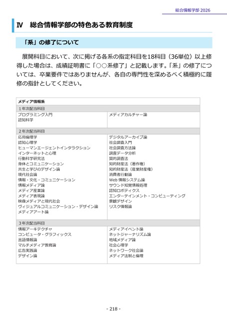 Ⅳ総合情報学部の特色ある教育制度「系」の修了について総合情報学部2026展開科目において、次に掲げる各系の指定科目を18科目(36単位)以上修得した場合は、成績証明書に「○○系修了」と記載します。「系」の修了については、卒業要件ではありませんが、各自の専門性を深めるべく積極的に履修の指針としてください。メディアカルチャー論デジタルアーカイブ論社会調査入門社会調査方法論調査データ分析質的調査法知的財産法(著作権)知的財産法(産業財産権)消費者行動論Web情報システム論サウンド知覚情報処理認知ロボティクスエンターテインメント・コンピューティング景観デザインリスク情報論メディアイベント論ネットジャーナリズム論地域メディア論社会心理学ネットワーク社会論メディア法制と倫理-218-メディア情報系1年次配当科目プログラミング入門認知科学2年次配当科目応用倫理学認知心理学ヒューマンエージェントインタラクションインターネットと心理行動科学研究法身体とコミュニケーション共生と学びのデザイン論現代社会論情報・文化・コミュニケーション情報メディア論メディア産業論メディア表現論映像メディアと現代社会ヴィジュアルコミュニケーション・デザイン論メディアアート論3年次配当科目情報アーキテクチャコンピュータ・グラフィックス言語情報論マルチメディア教育論広告実践論デザイン論