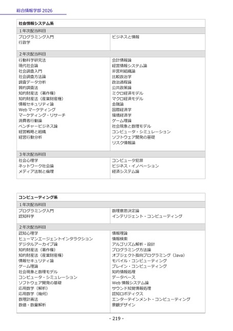 ビジネスと情報会計情報論経営情報システム論非営利組織論比較政治学政治過程論公共政策論ミクロ経済モデルマクロ経済モデル金融論国際経済学環境経済学ゲーム理論社会現象と数理モデルコンピュータ・シミュレーションソフトウェア開発の基礎リスク情報論コンピュータ犯罪ビジネス・イノベーション経済システム論数理意思決定論インテリジェント・コンピューティング情報理論情報検索アルゴリズム解析・設計プログラミング方法論オブジェクト指向プログラミング(Java)モバイル・コンピューティングブレイン・コンピューティング知的情報処理データベースWeb情報システム論サウンド知覚情報処理認知ロボティクスエンターテインメント・コンピューティング景観デザイン-219-総合情報学部2026社会情報システム系1年次配当科目プログラミング入門行政学2年次配当科目行動科学研究法現代社会論社会調査入門社会調査方法論調査データ分析質的調査法知的財産法(著作権)知的財産法(産業財産権)情報セキュリティ論Webマーケティングマーケティング・リサーチ消費者行動論ベンチャービジネス論経営戦略と組織経営行動分析3年次配当科目社会心理学ネットワーク社会論メディア法制と倫理コンピューティング系1年次配当科目プログラミング入門認知科学2年次配当科目認知心理学ヒューマンエージェントインタラクションデジタルアーカイブ論知的財産法(著作権)知的財産法(産業財産権)情報セキュリティ論ゲーム理論社会現象と数理モデルコンピュータ・シミュレーションソフトウェア開発の基礎応用数学(解析)応用数学(幾何)数理計画法数値・数量解析