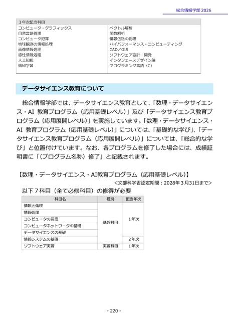 3年次配当科目コンピュータ・グラフィックス自然言語処理コンピュータ犯罪地球観測の情報処理画像情報処理感性情報処理人工知能機械学習総合情報学部2026ベクトル解析関数解析情報伝送の物理ハイパフォーマンス・コンピューティングCAD/GISソフトウェア設計・開発インタフェースデザイン論プログラミング言語(C)データサイエンス教育について総合情報学部では、データサイエンス教育として、「数理・データサイエンス・AI教育プログラム(応用基礎レベル)」及び「データサイエンス教育プログラム(応用展開レベル)」を実施しています。「数理・データサイエンス・AI教育プログラム(応用基礎レベル)」については、「基礎的な学び」、「データサイエンス教育プログラム(応用展開レベル)」については、「総合的な学び」と位置付けています。なお、各プログラムを修了した場合には、成績証明書に「(プログラム名称)修了」と記載されます。【数理・データサイエンス・AI教育プログラム(応用基礎レベル)】<文部科学省認定期間:2028年3月31日まで>以下7科目(全て必修科目)の修得が必要科目名種別配当年次基幹科目1年次実習科目2年次1年次-220-情報と倫理情報処理コンピュータの言語コンピュータネットワークの基礎データサイエンスの基礎情報システムの基礎ソフトウェア実習