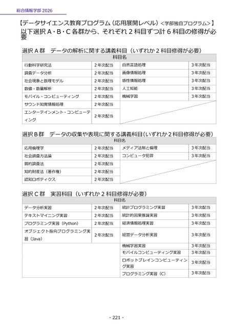 総合情報学部2026【データサイエンス教育プログラム(応用展開レベル)<学部独自プログラム>】以下選択A・B・C各群から、それぞれ2科目ずつ計6科目の修得が必要選択A群データの解析に関する講義科目(いずれか2科目修得が必要)科目名行動科学研究法調査データ分析社会現象と数理モデル数値・数量解析モバイル・コンピューティングサウンド知覚情報処理エンターテインメント・コンピューテ自然言語処理画像情報処理感性情報処理人工知能機械学習2年次配当2年次配当2年次配当2年次配当2年次配当2年次配当2年次配当3年次配当3年次配当3年次配当3年次配当3年次配当データの収集や表現に関する講義科目(いずれか2科目修得が必要)科目名応用倫理学社会調査方法論質的調査法知的財産法(著作権)認知ロボティクス2年次配当2年次配当2年次配当2年次配当2年次配当メディア法制と倫理コンピュータ犯罪3年次配当3年次配当3年次配当3年次配当3年次配当3年次配当3年次配当3年次配当3年次配当3年次配当データ分析実習テキストマイニング実習プログラミング実習(Python)オブジェクト指向プログラミング実習(Java)2年次配当2年次配当2年次配当統計プログラミング実習統計的因果推論実習経済情報処理実習2年次配当経営データ分析実習実習科目(いずれか2科目修得が必要)科目名択C群選機械学習実習モバイルコンピューティング実習ロボットブレインコンピューティング実習プログラミング実習(C)-221-ィング選択B群
