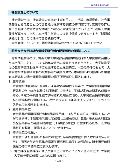 社会調査士について総合情報学部2026社会調査士は、社会調査の知識や技術を用いて、世論、市場動向、社会事象等をとらえることのできる能力を有する調査の専門家です。変貌するIT社会に生起するさまざまな問題への対応と解決を図っていく上で、近年その重要性が高まっており、本学部生が身につける「情報リテラシー」と「問題解決能力」を十分に活用できる資格です。資格要件については、総合情報学部Webサイトよりご確認ください。関西大学大学院総合情報学研究科の授業科目の履修について総合情報学部では、関西大学大学院総合情報学研究科の入学試験に合格した本学部生に対して、より高度な勉学の機会を与えるとともに、大学院進学後の教育研究活動を円滑に推進することを目的に、一定の条件のもとで、大学院総合情報学研究科の授業科目の履修を認め、本制度により修得した単位を本研究科の博士課程前期課程の修了所要単位に算入します。1履修資格本学総合情報学部に在学し、4年次春学期終了時点で、大学院総合情報学研究科の学内進学試験(6月募集)に合格し、学部が定めた所定の成績を修め、所定の手続きを経て許可された場合に限り、大学院総合情報学研究科の授業科目を履修することができます(詳細はインフォメーションシステムでお知らせします)。2履修制限単位大学院総合情報学研究科の授業科目は、3科目6単位まで履修することができます。本制度を利用して修得した単位数は、教職・その他の科目及び配当外科目の履修制限単位(1学期15単位)に含まれるため、その履修制限を超えて履修することはできません。3修得単位の取扱い本制度により修得した科目の単位は、卒業所要単位に算入されません。ただし、関西大学大学院総合情報学研究科に進学した場合は、博士課程前期課程の修了所要単位に算入します。※博士課程前期課程の修了所要単位に含めることができる単位は、大学院入学前年度に修得したものに限ります。-222-