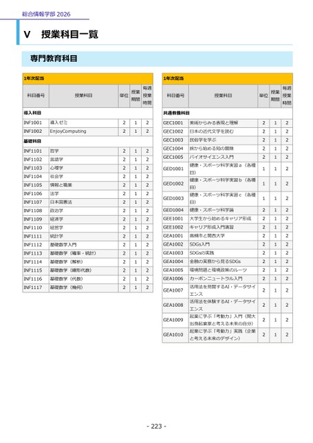 単位授業期間毎週授業時間222222222222222222211111111111111111112222222222222222222科目番号授業科目共通教養科目GEC1001美術からみる表現と理解GEC1002日本の近代文学を読むGEC1003民俗学を学ぶGEC1004旅から始める知の冒険GEC1005GED1001GED1002GED1003GED1004バイオサイエンス入門健康・スポーツ科学実習a(各種目)健康・スポーツ科学実習b(各種目)健康・スポーツ科学実習c(各種目)健康・スポーツ科学論GEE1001大学生から始めるキャリア形成GEE1002キャリア形成入門演習GEA1001高槻市と関西大学GEA1002SDGs入門GEA1003SDGsの実践GEA1004金融の実務から見るSDGsGEA1005環境問題と環境政策のルーツGEA1006GEA1007GEA1008GEA1009GEA1010カーボンニュートラル入門活用法を見聞するAI・データサイエンス活用法を体験するAI・データサイエンス起業に学ぶ「考動力」入門(関大出身起業家と考える未来の自分)起業に学ぶ「考動力」実践(企業と考える未来のデザイン)単位授業期間毎週授業時間222221112222222222222111111111111111111111222222222222222222222科目番号授業科目導入科目INF1001INF1002基礎科目INF1101INF1102INF1103INF1104INF1105INF1106INF1107INF1108INF1109INF1110INF1111INF1112INF1113INF1114INF1115INF1116INF1117導入ゼミEnjoyComputing哲学言語学心理学社会学情報と職業法学日本国憲法政治学経済学経営学統計学基礎数学入門基礎数学(確率・統計)基礎数学(解析)基礎数学(線形代数)基礎数学(代数)基礎数学(幾何)総合情報学部2026Ⅴ授業科目一覧専門教育科目1年次配当1年次配当-223-