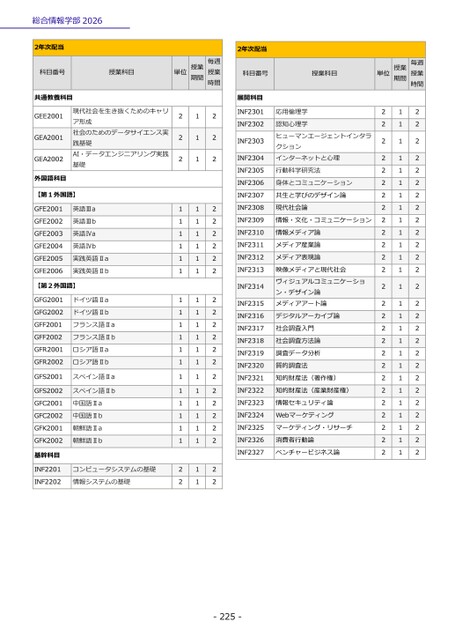 総合情報学部20262年次配当科目番号授業科目共通教養科目現代社会を生き抜くためのキャリア形成社会のためのデータサイエンス実践基礎AI・データエンジニアリング実践基礎GEE2001GEA2001GEA2002外国語科目【第1外国語】GFE2001GFE2002GFE2003GFE2004GFE2005GFE2006英語Ⅲa英語Ⅲb英語Ⅳa英語Ⅳb実践英語Ⅱa実践英語Ⅱb【第2外国語】GFG2001ドイツ語ⅡaGFG2002ドイツ語ⅡbGFF2001GFF2002フランス語Ⅱaフランス語ⅡbGFR2001ロシア語ⅡaGFR2002ロシア語ⅡbGFS2001スペイン語Ⅱaスペイン語Ⅱb中国語Ⅱa中国語Ⅱb朝鮮語Ⅱa朝鮮語Ⅱbコンピュータシステムの基礎情報システムの基礎GFS2002GFC2001GFC2002GFK2001GFK2002基幹科目INF2201INF22022年次配当科目番号授業科目単位授業期間毎週授業時間単位授業期間毎週授業時間展開科目INF2301INF2302INF2303INF2304INF2305INF2306INF2307INF2308INF2309INF2310INF2311INF2312INF2313INF2314INF2315INF2316INF2317INF2318INF2319INF2320INF2321INF2322INF2323INF2324INF2325INF2326INF2327222111111111111111111221111111111111111111111122222222222222222222222応用倫理学認知心理学ヒューマンエージェントインタラクションインターネットと心理行動科学研究法身体とコミュニケーション共生と学びのデザイン論現代社会論情報・文化・コミュニケーション情報メディア論メディア産業論メディア表現論映像メディアと現代社会ヴィジュアルコミュニケーション・デザイン論メディアアート論デジタルアーカイブ論社会調査入門社会調査方法論調査データ分析質的調査法知的財産法(著作権)知的財産法(産業財産権)情報セキュリティ論Webマーケティングマーケティング・リサーチ消費者行動論ベンチャービジネス論222222222222222222222222222111111111111111111111111111222222222222222222222222222-225-