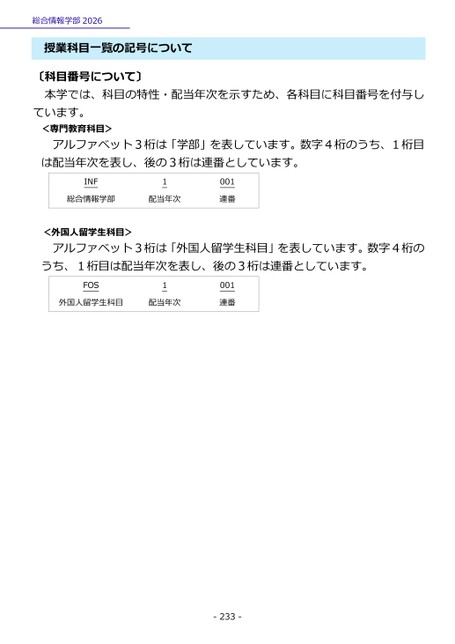 総合情報学部2026授業科目一覧の記号について〔科目番号について〕ています。本学では、科目の特性・配当年次を示すため、各科目に科目番号を付与し<専門教育科目>アルファベット3桁は「学部」を表しています。数字4桁のうち、1桁目は配当年次を表し、後の3桁は連番としています。INF1総合情報学部配当年次001連番<外国人留学生科目>アルファベット3桁は「外国人留学生科目」を表しています。数字4桁のうち、1桁目は配当年次を表し、後の3桁は連番としています。FOS1外国人留学生科目配当年次001連番-233-