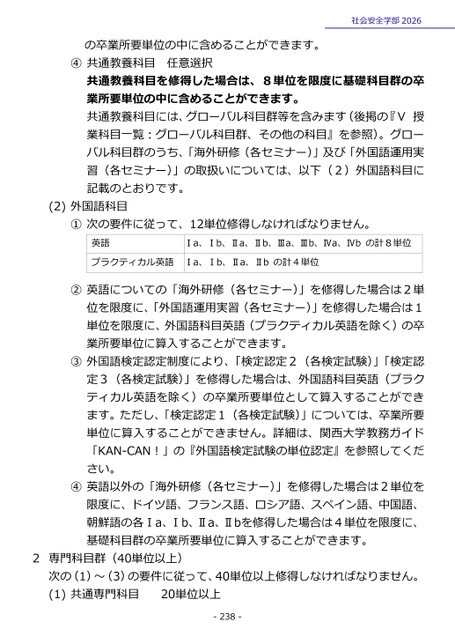 の卒業所要単位の中に含めることができます。④共通教養科目任意選択社会安全学部2026共通教養科目を修得した場合は、8単位を限度に基礎科目群の卒業所要単位の中に含めることができます。共通教養科目には、グローバル科目群等を含みます(後掲の『Ⅴ授業科目一覧:グローバル科目群、その他の科目』を参照)。グローバル科目群のうち、「海外研修(各セミナー)」及び「外国語運用実習(各セミナー)」の取扱いについては、以下(2)外国語科目に記載のとおりです。(2)外国語科目①次の要件に従って、12単位修得しなければなりません。英語Ⅰa、Ⅰb、Ⅱa、Ⅱb、Ⅲa、Ⅲb、Ⅳa、Ⅳbの計8単位プラクティカル英語Ⅰa、Ⅰb、Ⅱa、Ⅱbの計4単位②英語についての「海外研修(各セミナー)」を修得した場合は2単位を限度に、「外国語運用実習(各セミナー)」を修得した場合は1単位を限度に、外国語科目英語(プラクティカル英語を除く)の卒業所要単位に算入することができます。③外国語検定認定制度により、「検定認定2(各検定試験)」「検定認定3(各検定試験)」を修得した場合は、外国語科目英語(プラクティカル英語を除く)の卒業所要単位として算入することができます。ただし、「検定認定1(各検定試験)」については、卒業所要単位に算入することができません。詳細は、関西大学教務ガイド「KAN-CAN!」の『外国語検定試験の単位認定』を参照してください。④英語以外の「海外研修(各セミナー)」を修得した場合は2単位を限度に、ドイツ語、フランス語、ロシア語、スペイン語、中国語、朝鮮語の各Ⅰa、Ⅰb、Ⅱa、Ⅱbを修得した場合は4単位を限度に、基礎科目群の卒業所要単位に算入することができます。2専門科目群(40単位以上)次の(1)~(3)の要件に従って、40単位以上修得しなければなりません。(1)共通専門科目20単位以上-238-