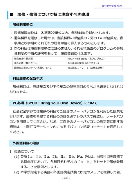 Ⅲ履修・修得について特に注意すべき事項社会安全学部2026履修制限単位1履修制限単位は、各学期22単位以内、年間44単位以内とします。2通年科目を履修した場合は、当該科目の単位数の2分の1の単位数を、春学期と秋学期のそれぞれの履修単位に算入するものとします。3次の科目は履修制限単位に含めません。それぞれ該当のプログラムの参加、各制度の申請の許可をもって、履修登録に代えます。社会安全体験実習海外研修(各セミナー)KUGFFieldStudy(各プログラム)外国語運用実習(各セミナー)国際協力ボランティア実習A・B・C検定認定1・2・3(各検定試験)目履修の配当年次科履修科目は、当該年次及び下位年次の配当科目のうちから選択しなければなりません。C必須(BYOD:BringYourOwnDevice)についてP社会安全学部では複数の科目でご自身のノートパソコンを利用した授業を行います。履修を希望する科目の方針を必ずシラバスで確認し、ノートパソコンを用意してください。なお、ご自身のノートパソコンの設定等に関する相談は、4階ITステーション内にある「パソコン相談コーナー」を活用してください。外国語科目の履修1英語について(1)英語Ⅰa、Ⅰb、Ⅱa、Ⅱb、Ⅲa、Ⅲb、Ⅳa、Ⅳbは、当該科目を履修する初年度において、各科目それぞれの「a・b」をセットで履修登録することを原則とします。(2)本学が指定する英語の外国語検定試験で所定のスコアを取得した者、-240-