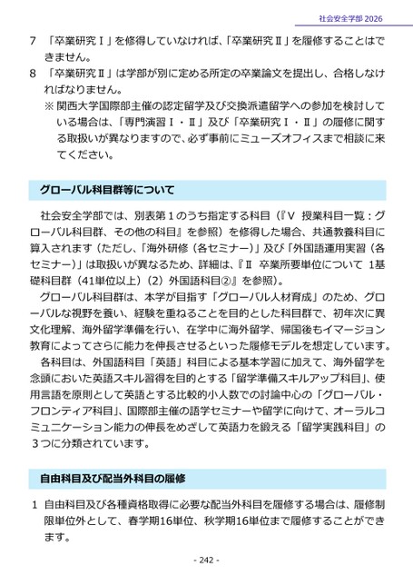 7「卒業研究Ⅰ」を修得していなければ、「卒業研究Ⅱ」を履修することはで社会安全学部2026きません。8「卒業研究Ⅱ」は学部が別に定める所定の卒業論文を提出し、合格しなければなりません。※関西大学国際部主催の認定留学及び交換派遣留学への参加を検討している場合は、「専門演習Ⅰ・Ⅱ」及び「卒業研究Ⅰ・Ⅱ」の履修に関する取扱いが異なりますので、必ず事前にミューズオフィスまで相談に来てください。グローバル科目群等について社会安全学部では、別表第1のうち指定する科目(『Ⅴ授業科目一覧:グローバル科目群、その他の科目』を参照)を修得した場合、共通教養科目に算入されます(ただし、「海外研修(各セミナー)」及び「外国語運用実習(各セミナー)」は取扱いが異なるため、詳細は、『Ⅱ卒業所要単位について1基礎科目群(41単位以上)(2)外国語科目②』を参照)。グローバル科目群は、本学が目指す「グローバル人材育成」のため、グローバルな視野を養い、経験を重ねることを目的とした科目群で、初年次に異文化理解、海外留学準備を行い、在学中に海外留学、帰国後もイマージョン教育によってさらに能力を伸長させるといった履修モデルを想定しています。各科目は、外国語科目「英語」科目による基本学習に加えて、海外留学を念頭においた英語スキル習得を目的とする「留学準備スキルアップ科目」、使用言語を原則として英語とする比較的小人数での討論中心の「グローバル・フロンティア科目」、国際部主催の語学セミナーや留学に向けて、オーラルコミュニケーション能力の伸長をめざして英語力を鍛える「留学実践科目」の3つに分類されています。由科目及び配当外科目の履修自1自由科目及び各種資格取得に必要な配当外科目を履修する場合は、履修制限単位外として、春学期16単位、秋学期16単位まで履修することができます。-242-