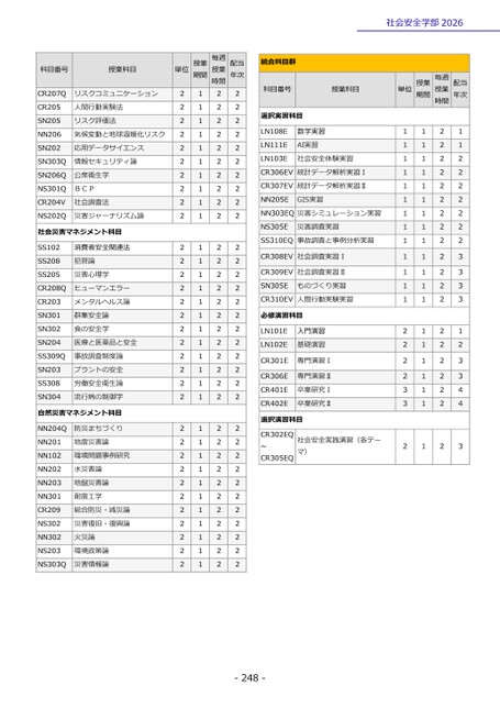 -248-社会安全学部2026科目番号授業科目単位期間授業時間毎週授業年次配当CR207Qリスクコミュニケーション2122CR205人間行動実験法2122SN205リスク評価法2122NN206気候変動と地球温暖化リスク2122SN202応用データサイエンス2122SN303Q情報セキュリティ論2122SN206Q公衆衛生学2122NS301QBCP2122CR204V社会調査法2122NS202Q災害ジャーナリズム論2122社会災害マネジメント科目SS102消費者安全関連法2122SS208犯罪論2122SS205災害心理学2122CR208Qヒューマンエラー2122CR203メンタルヘルス論2122SN301群集安全論2122SN302食の安全学2122SN204医療と医薬品と安全2122SS309Q事故調査制度論2122SN203プラントの安全2122SS308労働安全衛生論2122SN304流行病の制御学2122自然災害マネジメント科目NN204Q防災まちづくり2122NN201地震災害論2122NN102環境問題事例研究2122NN202水災害論2122NN203地盤災害論2122NN301耐震工学2122CR209総合防災・減災論2122NS302災害復旧・復興論2122NN302火災論2122NS203環境政策論2122NS303Q災害情報論2122科目番号授業科目単位授業期間授業毎週時間配当年次選択実習科目LN108E数学実習1121LN111EAI実習1121LN103E社会安全体験実習1122CR306EV統計データ解析実習Ⅰ1122CR307EV統計データ解析実習Ⅱ1122NN205EGIS実習1122NN303EQ災害シミュレーション実習1122NS305E災害調査実習1122SS310EQ事故調査と事例分析実習1122CR308EV社会調査実習Ⅰ1123CR309EV社会調査実習Ⅱ1123SN305Eものづくり実習1123CR310EV人間行動実験実習1123必修演習科目LN101E入門演習2121LN102E基礎演習2122CR301E専門演習Ⅰ2123CR306E専門演習Ⅱ2123CR401E卒業研究Ⅰ3124CR402E卒業研究Ⅱ3124選択演習科目CR302EQ~CR305EQマ)社会安全実践演習(各テー2123統合科目群