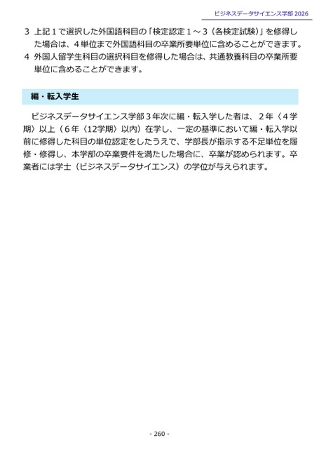 3上記1で選択した外国語科目の「検定認定1~3(各検定試験)」を修得しビジネスデータサイエンス学部2026た場合は、4単位まで外国語科目の卒業所要単位に含めることができます。4外国人留学生科目の選択科目を修得した場合は、共通教養科目の卒業所要単位に含めることができます。編・転入学生ビジネスデータサイエンス学部3年次に編・転入学した者は、2年〈4学期〉以上(6年〈12学期〉以内)在学し、一定の基準において編・転入学以前に修得した科目の単位認定をしたうえで、学部長が指示する不足単位を履修・修得し、本学部の卒業要件を満たした場合に、卒業が認められます。卒業者には学士(ビジネスデータサイエンス)の学位が与えられます。-260-
