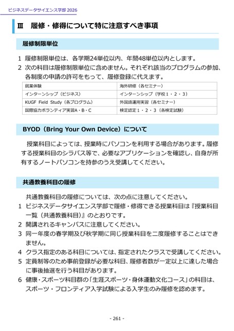 履修制限単位1履修制限単位は、各学期24単位以内、年間48単位以内とします。2次の科目は履修制限単位に含めません。それぞれ該当のプログラムの参加、各制度の申請の許可をもって、履修登録に代えます。海外研修(各セミナー)就業体験インターンシップ(学校1・2・3)インターンシップ(ビジネス)KUGFFieldStudy(各プログラム)国際協力ボランティア実習A・B・C外国語運用実習(各セミナー)検定認定1・2・3(各検定試験)BYOD(BringYourOwnDevice)について授業科目によっては、授業時にパソコンを利用する場合があります。履修する授業科目のシラバス等で、必要なアプリケーションを確認し、自身が所有するノートパソコンを持参のうえ受講してください。通教養科目の履修共共通教養科目の履修については、次の点に注意してください。1ビジネスデータサイエンス学部で履修・修得できる授業科目は『授業科目一覧(共通教養科目)』のとおりです。2開講されるキャンパスに注意してください。3同一年度の春学期及び秋学期に同じ授業科目を二度履修することはできません。4クラス指定のある科目については、指定されたクラスで受講してください。5定員制等のため事前登録が必要な科目、履修者数が一定以上に達した場合に事後抽選を行う科目があります。6健康・スポーツ科目群の「生涯スポーツ・身体運動文化コース」の科目は、スポーツ・フロンティア入学試験による入学生のみ履修を認めます。-261-ビジネスデータサイエンス学部2026Ⅲ履修・修得について特に注意すべき事項