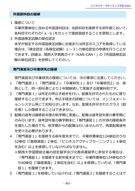 外国語科目の履修1履修についてビジネスデータサイエンス学部2026卒業所要単位に含める外国語科目は、当該科目を履修する初年度において、各科目それぞれの「a・b」をセットで履修登録することを原則とします。2外国語検定試験の単位認定本学が指定する外国語検定試験に合格または所定のスコアを取得している場合は、「検定認定(各検定試験)1~3」の単位認定の申請を行うことができます。詳細は、関西大学教務ガイド「KAN-CAN!」の『外国語検定試験の単位認定』を参照してください。門演習及び卒業研究の履修専専門演習及び卒業研究の履修については、次の事項に注意してください。1「専門演習1」、「専門演習2」、「卒業研究1」及び「卒業研究2」は、原則として、同一担任者により2年間継続して実施する授業科目です。2「専門演習1」は所定の申込手続きを行い、配属を許可されたものに限り履修することができます。申込手続きの詳細については、インフォメーションシステム等にてお知らせします。なお、配属を許可されたクラス(担任者)しか履修することはできません。3配属の選考は履修前年度の秋学期に実施し、配属は選考翌年度の春学期にのみ行います。選考翌年度の春学期末に「専門演習1」の次項の履修条件を満たした場合でも、秋学期からの配属は行いませんので、再度配属選考を受ける必要があります。4「専門演習1」を履修する前年度末までに、卒業所要単位124単位のうち52単位(「基礎演習」2単位、「ビジネスアクティブラーニング1」4単位を含む)以上を修得していなければなりません。※関西大学国際部主催の認定留学及び交換派遣留学に参加する場合は、「専門演習1」を履修する前年度末までに、卒業所要単位124単位のうち40単位(「基礎演習」2単位を含む)以上を修得していれば、「専門演習1」を履修できます。5「専門演習1」を修得していなければ、「専門演習2」を履修することはで-262-