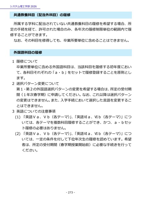 システム理工学部2026共通教養科目(配当外科目)の履修所属する学科に配当されていない共通教養科目の履修を希望する場合、所定の手続を経て、許可された場合のみ、各年次の履修制限単位の範囲内で履修することができます。なお、その科目を修得しても、卒業所要単位に含めることはできません。外国語科目の履修1履修について卒業所要単位に含める外国語科目は、当該科目を履修する初年度において、各科目それぞれの「a・b」をセットで履修登録することを原則とします。2選択パターン変更について第1・第2の外国語選択パターンの変更を希望する場合は、所定の受付期間(1年次春学期)に申請してください。なお、これ以降は選択パターンの変更はできません。また、入学手続において選択した言語を変更することはできません。3英語についての注意事項(1)「英語Ⅴa、Ⅴb(各テーマ)」、「英語Ⅵa、Ⅵb(各テーマ)」については、各テーマを複数科目履修することができ、かつ、a・bセット履修の必要はありません。(2)「英語Ⅴa、Ⅴb(各テーマ)」、「英語Ⅵa、Ⅵb(各テーマ)」については、一定の条件を付して下位年次生の履修を認めています。希望者は、所定の受付期間(春学期授業開始前)に必要な手続きを行ってください。-273-