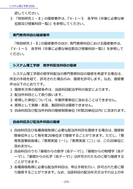 3「特別研究Ⅰ・Ⅱ」の履修要件は、『Ⅴ-1~5各学科(卒業に必要な単位数及び授業科目一覧)』を参照してください。門教育科目の履修要件専「特別研究Ⅰ・Ⅱ」の履修要件のほか、専門教育科目における履修要件は、各学科(卒業に必要な単位数及び授業科目一覧)』を参照して『Ⅴ-1~5ください。ステム理工学部他学科配当科目の履修シシステム理工学部の他学科配当の専門教育科目の履修を希望する場合は、所定の手続を経て、許可された場合のみ、履修を許可します。なお、履修要件は以下のとおりです。1履修年次等の履修条件は、当該科目配当学科の指定によります。2配当外科目として取り扱います。3修得した単位については、卒業所要単位に含めることはできません。4原則として実験・実習、製図科目は履修できません。5自由科目及び配当外科目の履修制限単位(年間20単位以内)に含まれます。自由科目及び配当外科目の履修1自由科目及び各種資格取得に必要な配当外科目を履修する場合は、履修制限単位外として毎年度20単位まで履修することができます。ただし、「教育実習事前指導」、「教育実習(一)」、「教育実習(二)」は、この20単位に含めません。2自由科目のうち「基礎からの数学(各テーマ)」、「基礎からの物理学(各テーマ)」、「基礎からの化学(各テーマ)」は許可されたものに限り履修することができます。3各種資格取得に必要な配当外科目は、申込手続を行い、許可された者に限り履修することができます。なお、当該科目の配当年次又はそれ以上の年システム理工学部2026認してください。-275-