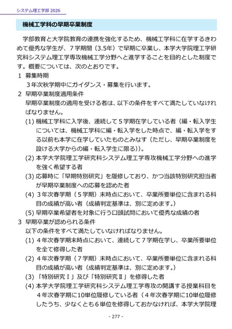 システム理工学部2026機械工学科の早期卒業制度学部教育と大学院教育の連携を強化するため、機械工学科に在学するきわめて優秀な学生が、7学期間(3.5年)で早期に卒業し、本学大学院理工学研究科システム理工学専攻機械工学分野へと進学することを目的とした制度です。概要については、次のとおりです。1募集時期3年次秋学期中にガイダンス・募集を行います。2早期卒業制度適用条件早期卒業制度の適用を受ける者は、以下の条件をすべて満たしていなければなりません。(1)機械工学科に入学後、連続して5学期在学している者(編・転入学生については、機械工学科に編・転入学をした時点で、編・転入学をする以前も本学に在学していたものとみなす(ただし、早期卒業制度を設ける大学からの編・転入学生に限る))。(2)本学大学院理工学研究科システム理工学専攻機械工学分野への進学を強く希望する者(3)応募時に「早期特別研究」を履修しており、かつ当該特別研究担当者が早期卒業制度への応募を認めた者(4)3年次春学期(5学期)末時点において、卒業所要単位に含まれる科目の成績が高い者(成績判定基準は、別に定めます。)(5)早期卒業希望者を対象に行う口頭試問において優秀な成績の者3早期卒業が認められる条件以下の条件をすべて満たしていなければなりません。(1)4年次春学期末時点において、連続して7学期在学し、卒業所要単位を全て修得した者(2)4年次春学期(7学期)末時点において、卒業所要単位に含まれる科目の成績が高い者(成績判定基準は、別に定めます。)(3)「特別研究Ⅰ」及び「特別研究Ⅱ」を修得した者(4)本学大学院理工学研究科システム理工学専攻の開講する授業科目を4年次春学期に10単位履修している者(4年次春学期に10単位履修したうち、少なくとも6単位を修得しておかなければ、本学大学院理-277-