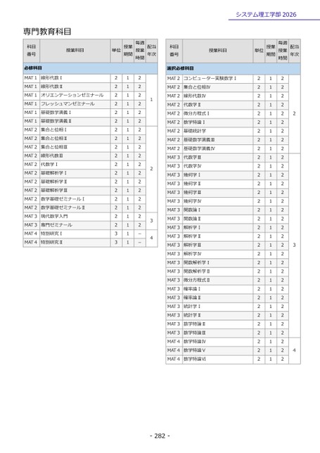 システム理工学部2026単位授業期間毎週授業時間配当年次科目番号授業科目単位授業期間毎週授業時間配当年次2222222222222222223311111111111111111111222222222222222222--1234選択必修科目MAT2コンピューター実験数学ⅠMAT2集合と位相ⅣMAT2線形代数ⅣMAT2代数学ⅡMAT2微分方程式ⅠMAT2数学特論ⅠMAT2基礎統計学MAT2基礎数学演義ⅢMAT2基礎数学演義ⅣMAT3代数学ⅢMAT3代数学ⅣMAT3幾何学ⅠMAT3幾何学ⅡMAT3幾何学ⅢMAT3幾何学ⅣMAT3関数論ⅠMAT3関数論ⅡMAT3解析学ⅠMAT3解析学ⅡMAT3解析学ⅢMAT3解析学ⅣMAT3関数解析学ⅠMAT3関数解析学ⅡMAT3微分方程式ⅡMAT3確率論ⅠMAT3確率論ⅡMAT3統計学ⅠMAT3統計学ⅡMAT3数学特論ⅡMAT3数学特論ⅢMAT4数学特論ⅣMAT4数学特論ⅤMAT4数学特論Ⅵ222222222222222222222222222222222111111111111111111111111111111111222222222222222222222222222222222234-282-専門教育科目授業科目科目番号必修科目MAT1線形代数ⅠMAT1線形代数ⅡMAT1オリエンテーションゼミナールMAT1フレッシュマンゼミナールMAT1基礎数学演義ⅠMAT1基礎数学演義ⅡMAT2集合と位相ⅠMAT2集合と位相ⅡMAT2集合と位相ⅢMAT2線形代数ⅢMAT2代数学ⅠMAT2基礎解析学ⅠMAT2基礎解析学ⅡMAT2基礎解析学ⅢMAT2数学基礎ゼミナールⅠMAT2数学基礎ゼミナールⅡMAT3現代数学入門MAT3専門ゼミナールMAT4特別研究ⅠMAT4特別研究Ⅱ