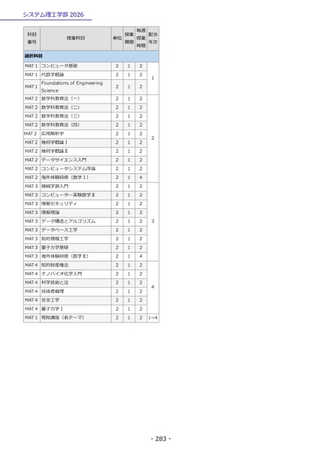 システム理工学部2026授業科目単位授業期間毎週授業時間配当年次科目番号選択科目MAT1コンピュータ基礎MAT1MAT1MAT2代数学概論FoundationsofEngineeringScience数学科教育法(一)MAT2数学科教育法(二)MAT2数学科教育法(三)MAT2数学科教育法(四)MAT2応用解析学MAT2幾何学概論ⅠMAT2幾何学概論ⅡMAT2データサイエンス入門MAT2コンピュータシステム序論MAT2海外体験研修(数学Ⅰ)MAT3機械学習入門MAT3コンピューター実験数学ⅡMAT3情報セキュリティMAT3情報理論MAT3データ構造とアルゴリズムMAT3データベース工学MAT3知的情報工学MAT3量子力学基礎MAT3海外体験研修(数学Ⅱ)MAT4知的財産権法MAT4ナノバイオ化学入門MAT4科学技術と法MAT4技術者倫理MAT4安全工学MAT4量子力学ⅠMAT1寄附講座(各テーマ)22222222222222222222222222222111111111111111111111111111112222222222224222222224222222212341~4-283-