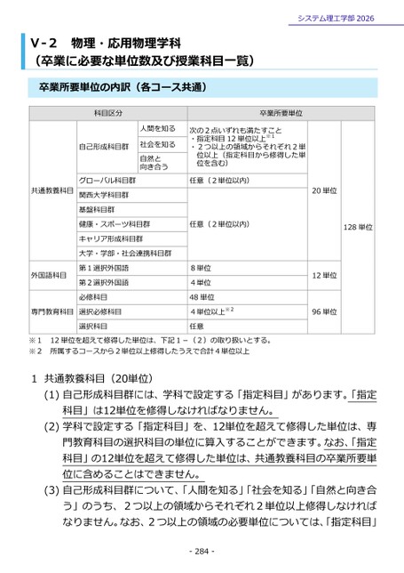 物理・応用物理学科Ⅴ-2(卒業に必要な単位数及び授業科目一覧)卒業所要単位の内訳(各コース共通)システム理工学部2026科目区分自己形成科目群卒業所要単位人間を知る社会を知る自然と向き合う次の2点いずれも満たすこと・指定科目12単位以上※1・2つ以上の領域からそれぞれ2単位以上(指定科目から修得した単位を含む)共通教養科目グローバル科目群関西大学科目群基盤科目群健康・スポーツ科目群キャリア形成科目群大学・学部・社会連携科目群外国語科目第1選択外国語第2選択外国語必修科目専門教育科目選択必修科目選択科目任意(2単位以内)20単位任意(2単位以内)128単位8単位4単位48単位4単位以上※2任意12単位96単位共通教養科目(20単位)(1)自己形成科目群には、学科で設定する「指定科目」があります。「指定科目」は12単位を修得しなければなりません。(2)学科で設定する「指定科目」を、12単位を超えて修得した単位は、専門教育科目の選択科目の単位に算入することができます。なお、「指定科目」の12単位を超えて修得した単位は、共通教養科目の卒業所要単位に含めることはできません。(3)自己形成科目群について、「人間を知る」「社会を知る」「自然と向き合う」のうち、2つ以上の領域からそれぞれ2単位以上修得しなければなりません。なお、2つ以上の領域の必要単位については、「指定科目」1※1※212単位を超えて修得した単位は、下記1-(2)の取り扱いとする。所属するコースから2単位以上修得したうえで合計4単位以上-284-