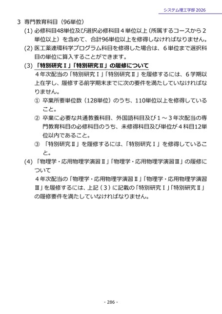 3専門教育科目(96単位)システム理工学部2026(1)必修科目48単位及び選択必修科目4単位以上(所属するコースから2単位以上)を含めて、合計96単位以上を修得しなければなりません。(2)医工薬連環科学プログラム科目を修得した場合は、6単位まで選択科目の単位に算入することができます。(3)「特別研究Ⅰ」「特別研究Ⅱ」の履修について4年次配当の「特別研究Ⅰ」「特別研究Ⅱ」を履修するには、6学期以上在学し、履修する前学期末までに次の要件を満たしていなければなりません。①卒業所要単位数(128単位)のうち、110単位以上を修得していること。②卒業に必要な共通教養科目、外国語科目及び1~3年次配当の専門教育科目の必修科目のうち、未修得科目及び単位が4科目12単位以内であること。③「特別研究Ⅱ」を履修するには、「特別研究Ⅰ」を修得していること。(4)「物理学・応用物理学演習Ⅱ」「物理学・応用物理学演習Ⅲ」の履修について4年次配当の「物理学・応用物理学演習Ⅱ」「物理学・応用物理学演習Ⅲ」を履修するには、上記(3)に記載の「特別研究Ⅰ」「特別研究Ⅱ」の履修要件を満たしていなければなりません。-286-